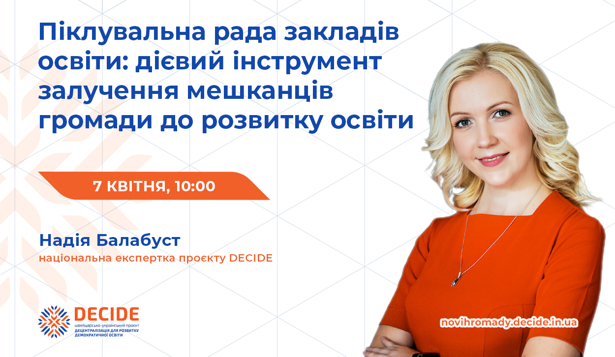 Запрошуємо керівників органів управління освітою, управлінські команди територіальних громад та керівників закладів освіти долучитися до вебінару, організованого Швейцарсько-українським проєктом DECIDE у межах кампанії «Освіта у нових громадах від А до Я».