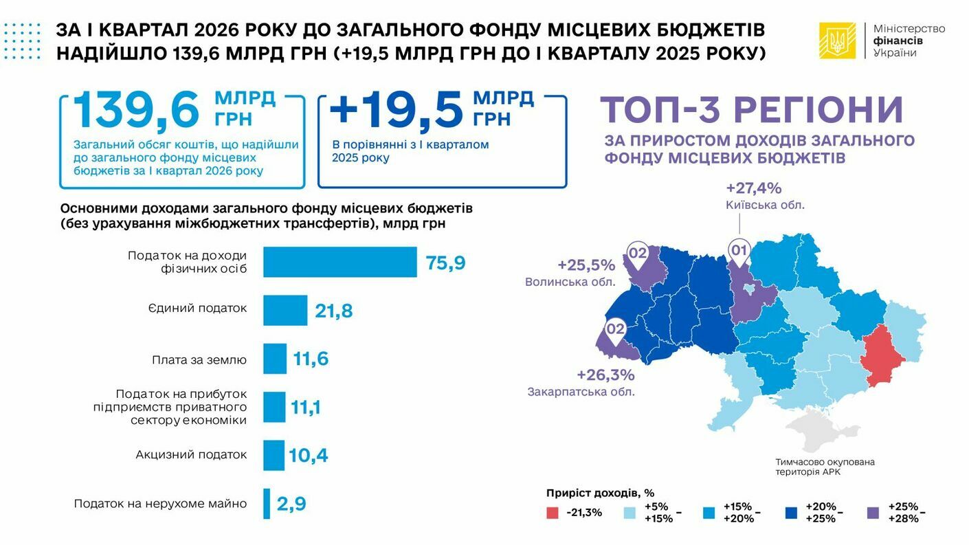 Протягом I кварталу (січень-березень) 2026 року до загального фонду місцевих бюджетів надійшло 139,6 млрд грн, що на 19,5 млрд грн більше ніж за I квартал 2025 року.