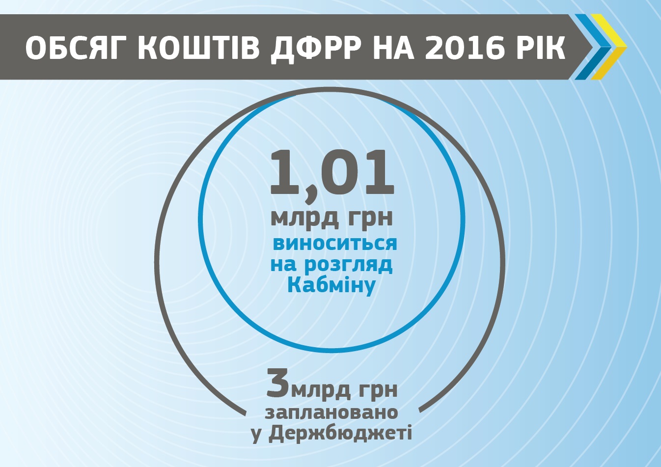 Як відомо, 22 регіони вже підготували та подали до Мінрегіону перелік проектів та програм, які плануються реалізації за кошти ДФРР у 2016 році. Але через низьку якість підготовки цих проектів, значну їх кількість повернуто на доопрацювання. Херсонська та Черкаська облдержадміністрації взагалі ще не подали жодного проекту.