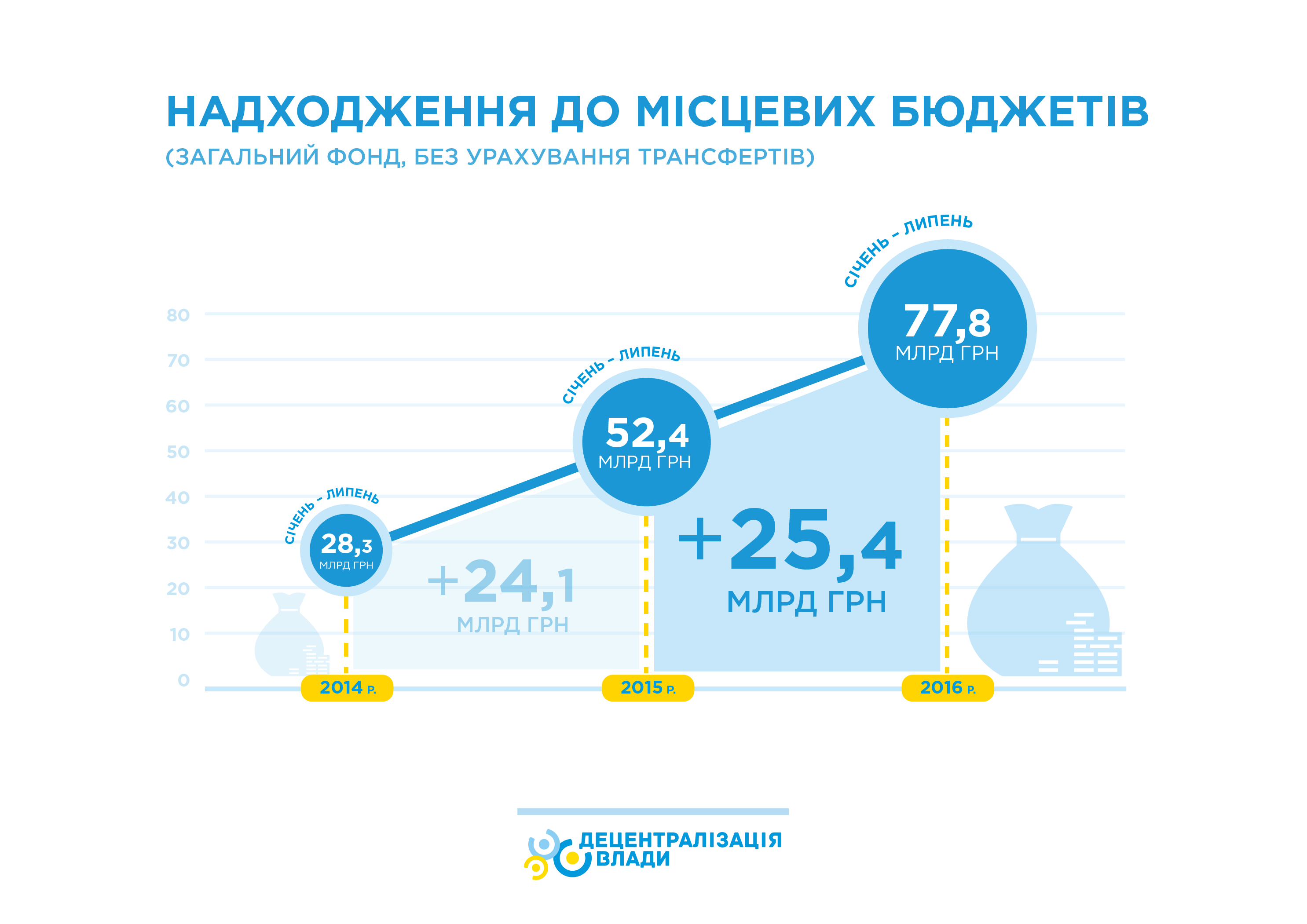 Бюджетна децентралізація набирає обертів. За січень–липень до місцевих бюджетів (без урахування трансфертів) надійшло 77,8 млрд грн. Маємо приріст проти аналогічного періоду минулого року у 25,4 млрд. грн. Про це сьогодні повідомив Віце-прем’єр-міністр – Міністр регіонального розвитку, будівництва та ЖКГ Геннадій Зубко.