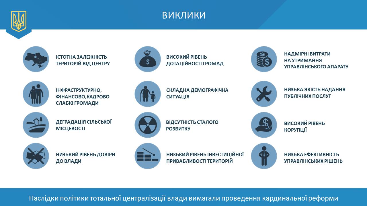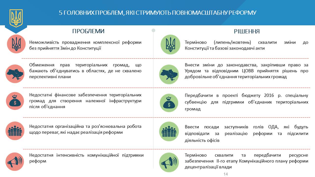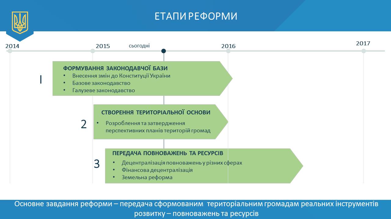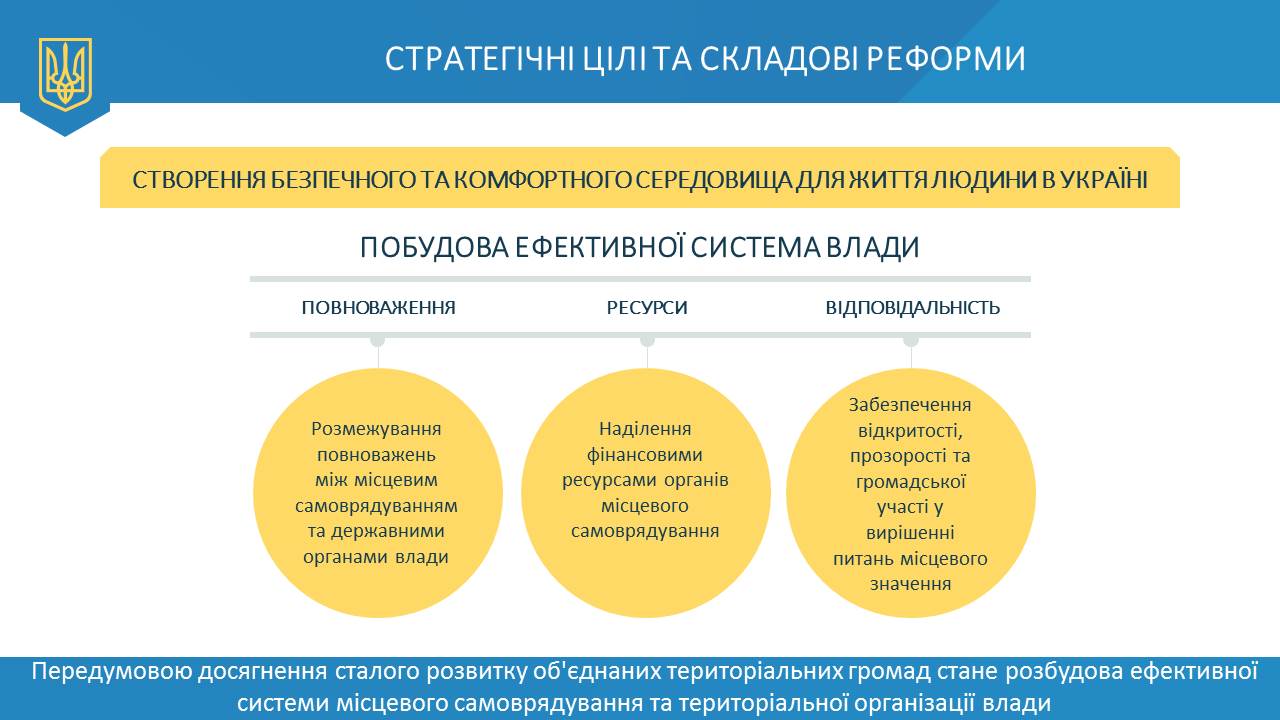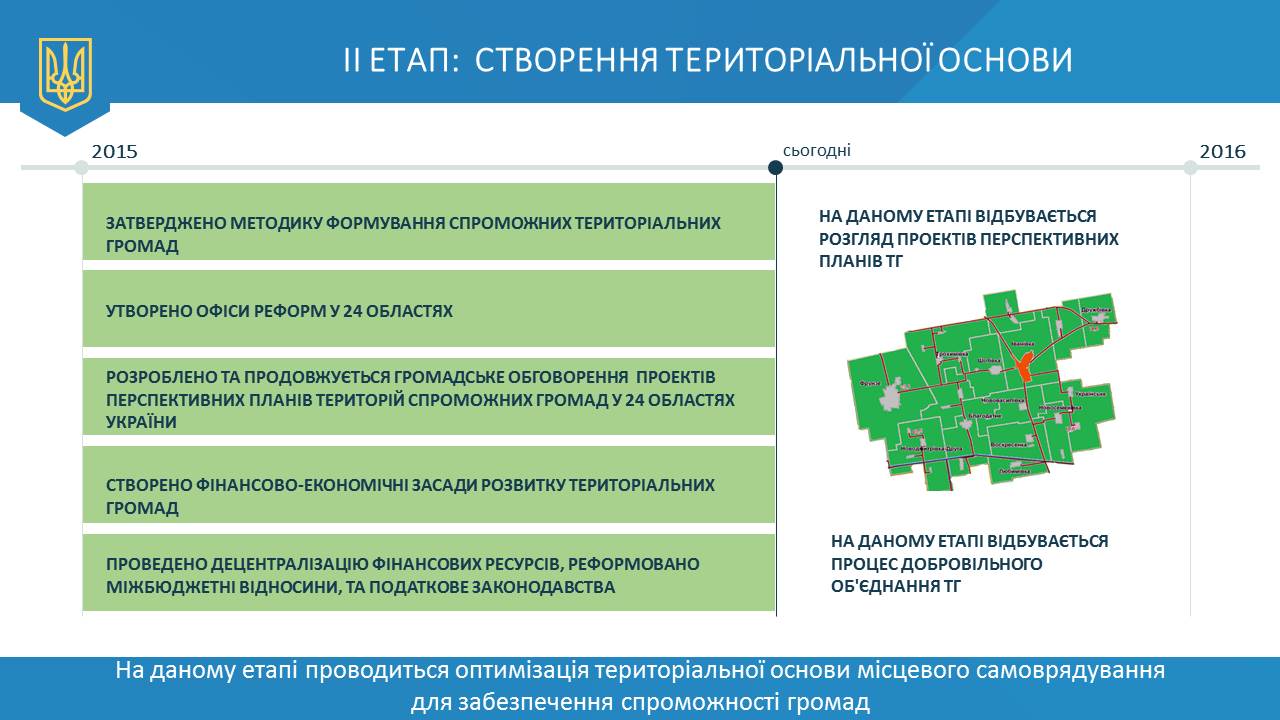 Віце-прем'єр-міністр України нагадав, що схвалено Концепцію реформування місцевого самоврядування та територіальної організації влади, План заходів з її реалізації, необхідні закони - Про добровільне об'єднання територіальних громад, Про засади державної регіональної політики. Мінрегіоном розроблено і затверджено Методику формування спроможних територіальних громад, утворено Офіси реформ у 24 областях.