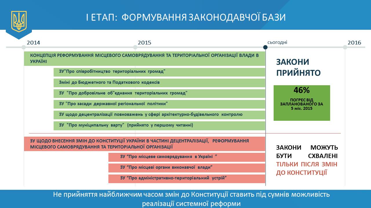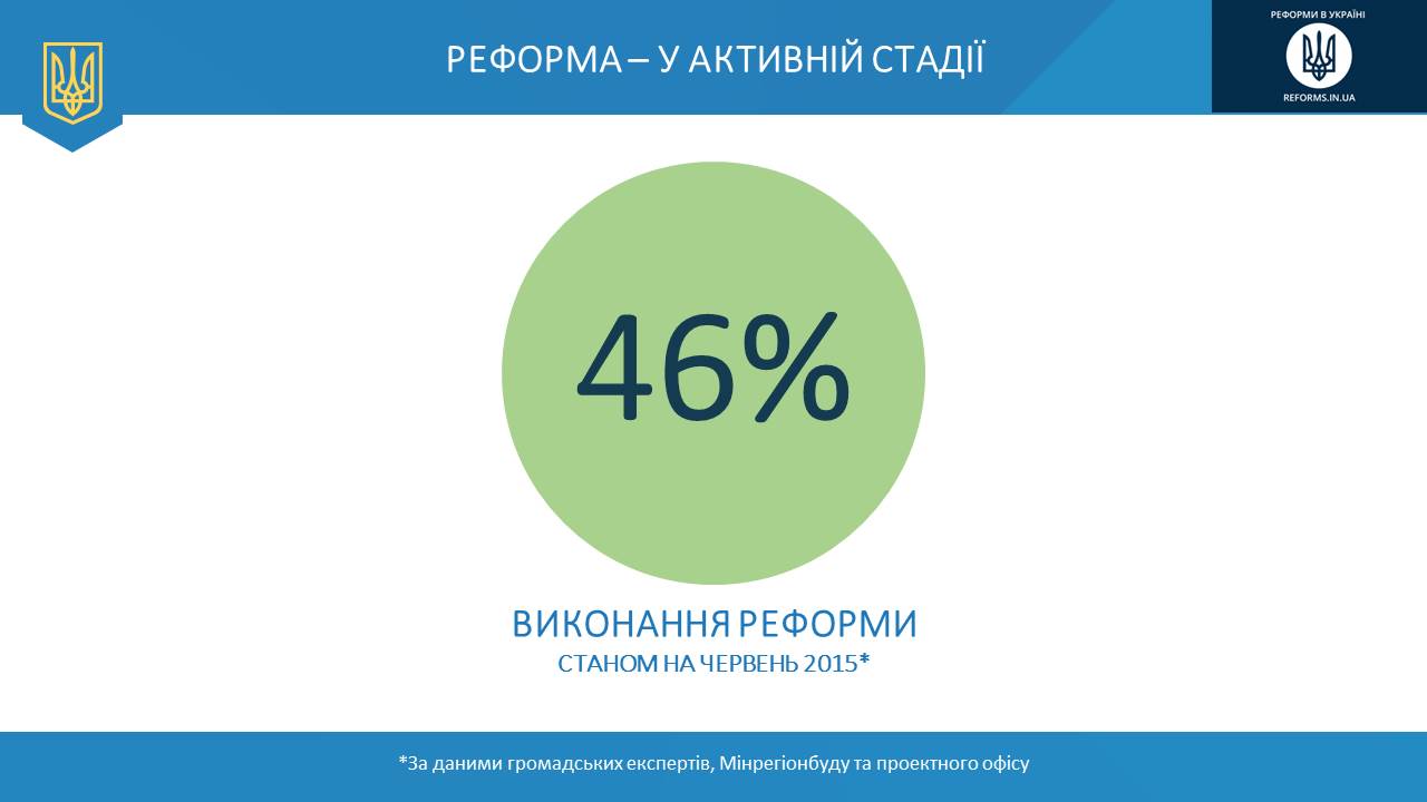 «За результатами оцінки громадських експертів, міжнародних фахівців та проектного Офісу реформ прогрес реалізації реформ складає 46%,» - сказав Віце-прем'єр-міністр - Міністр регіонального розвитку, будівництва та житлово-комунального господарства України Геннадій Зубко під час засідання Ради регіонального розвитку.