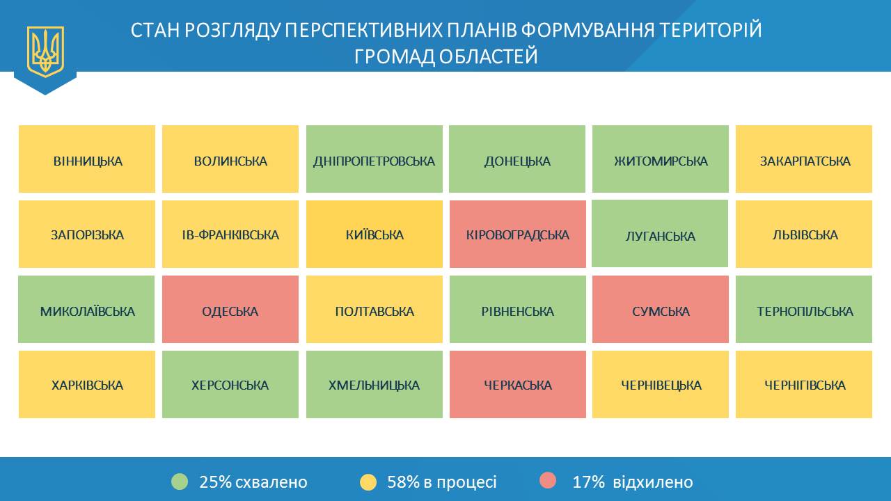 За його словами, вже схвалили перспективні плани розвитку територій Дніпропетровська, Донецька, Житомирська, Луганська, Херсонська та Хмельницька області. Рівненська та Миколаївська - прийняли відповідні рішення сьогодні.