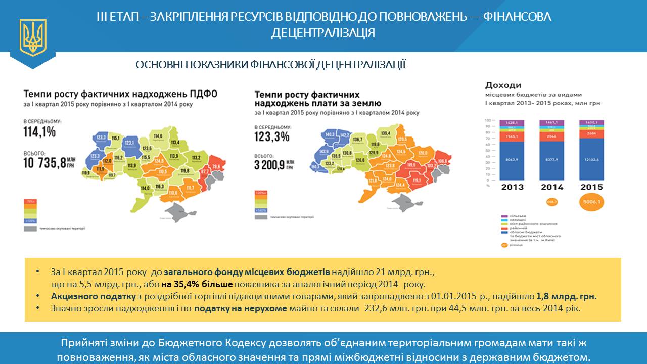 Віце-прем'єр-міністр України наголосив, що вже проведено бюджетну децентралізацію, в результаті якої лише за 1 квартал 2015 року надходження до місцевих бюджетів збільшились на 5,5 млрд. грн. і склали 21 млрд. грн.