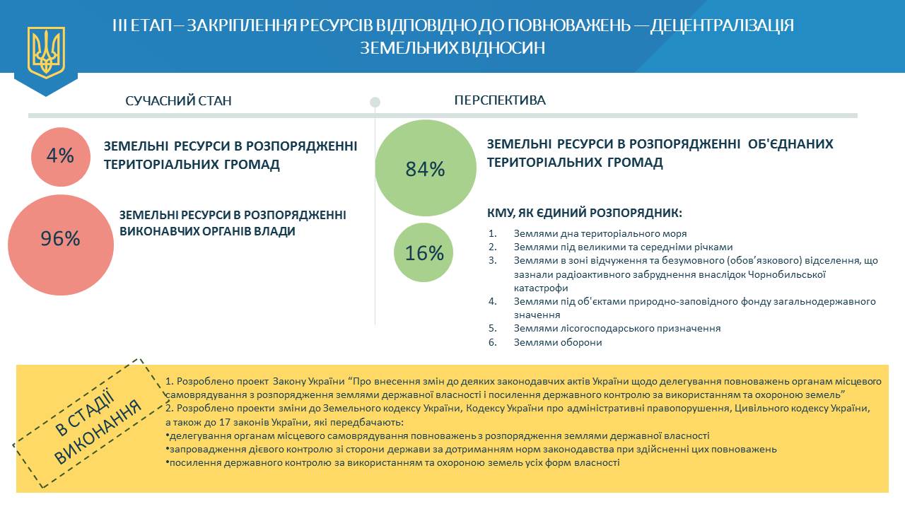«Децентралізація повноважень у сфері земельних відносин передбачає збільшення площі земельних ресурсів в розпорядженні об’єднаних територіальних громад з 4% до 84% та відповідно зменшення - в розпорядженні виконавчих органів влади з 96% до 16%», - пояснив Геннадій Зубко.