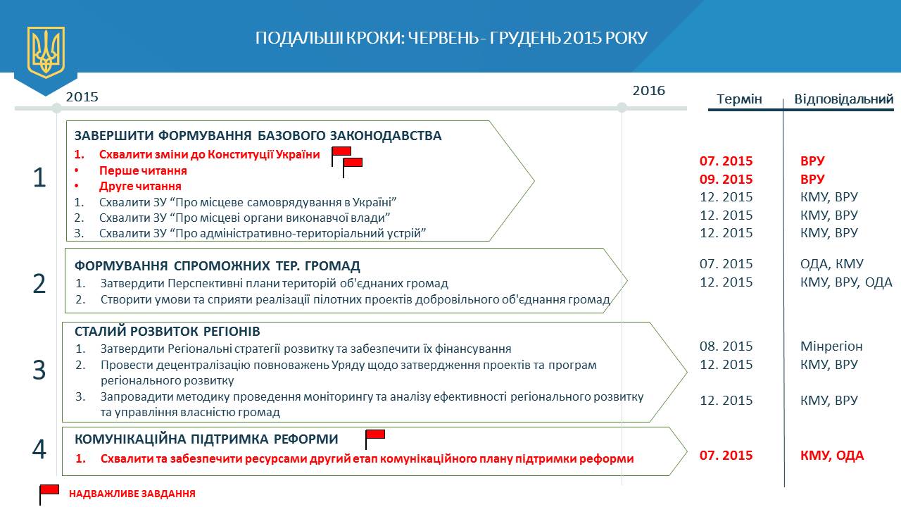 «Успішна реалізація реформи можлива за умови прийняття змін до Конституції України. Робота Конституційної комісії над цими знаходиться в активній завершальній стадії»,- наголосив Геннадій Зубко.