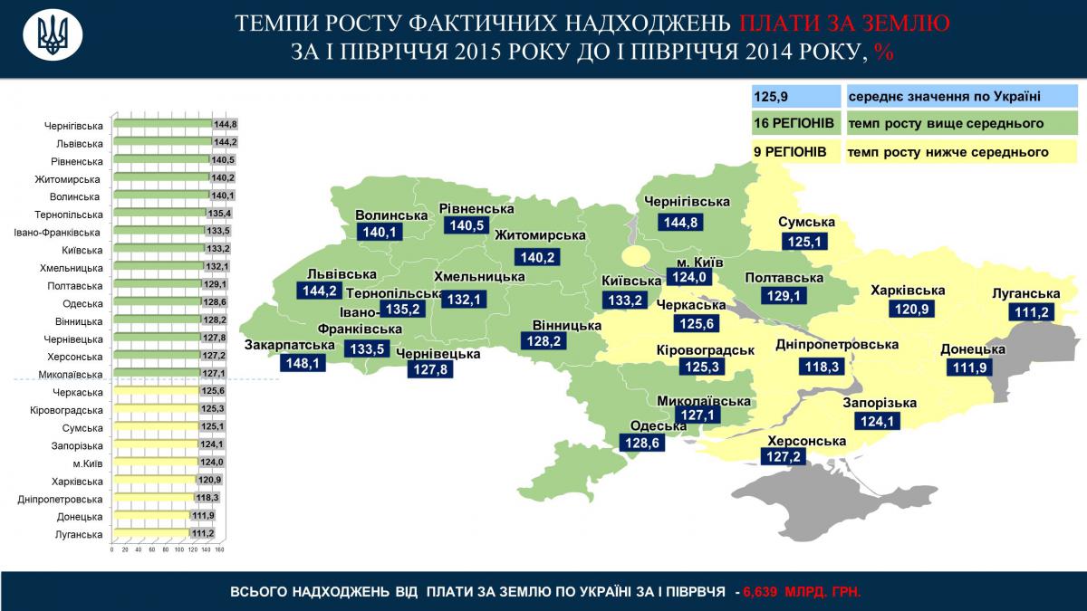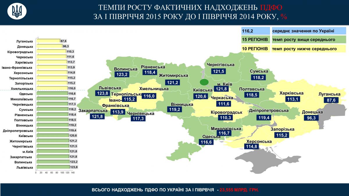 Темп росту фактичних надходжень ПДФО до січня-червня 2014 року становить 116,2%, плати за землю - 125,9%. При цьому, у 15 та 16 регіонах відповідно темп росту вище середнього по Україні.