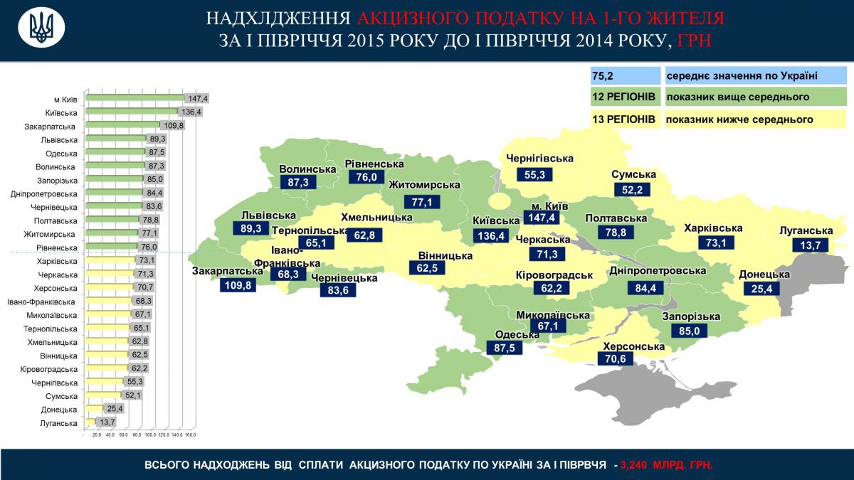 Станом на 01.07.2015 фактичні надходження акцизного податку склали 3 240,9 млн. грн., що в розрахунку на одного жителя країни складає 75,2 гривень.