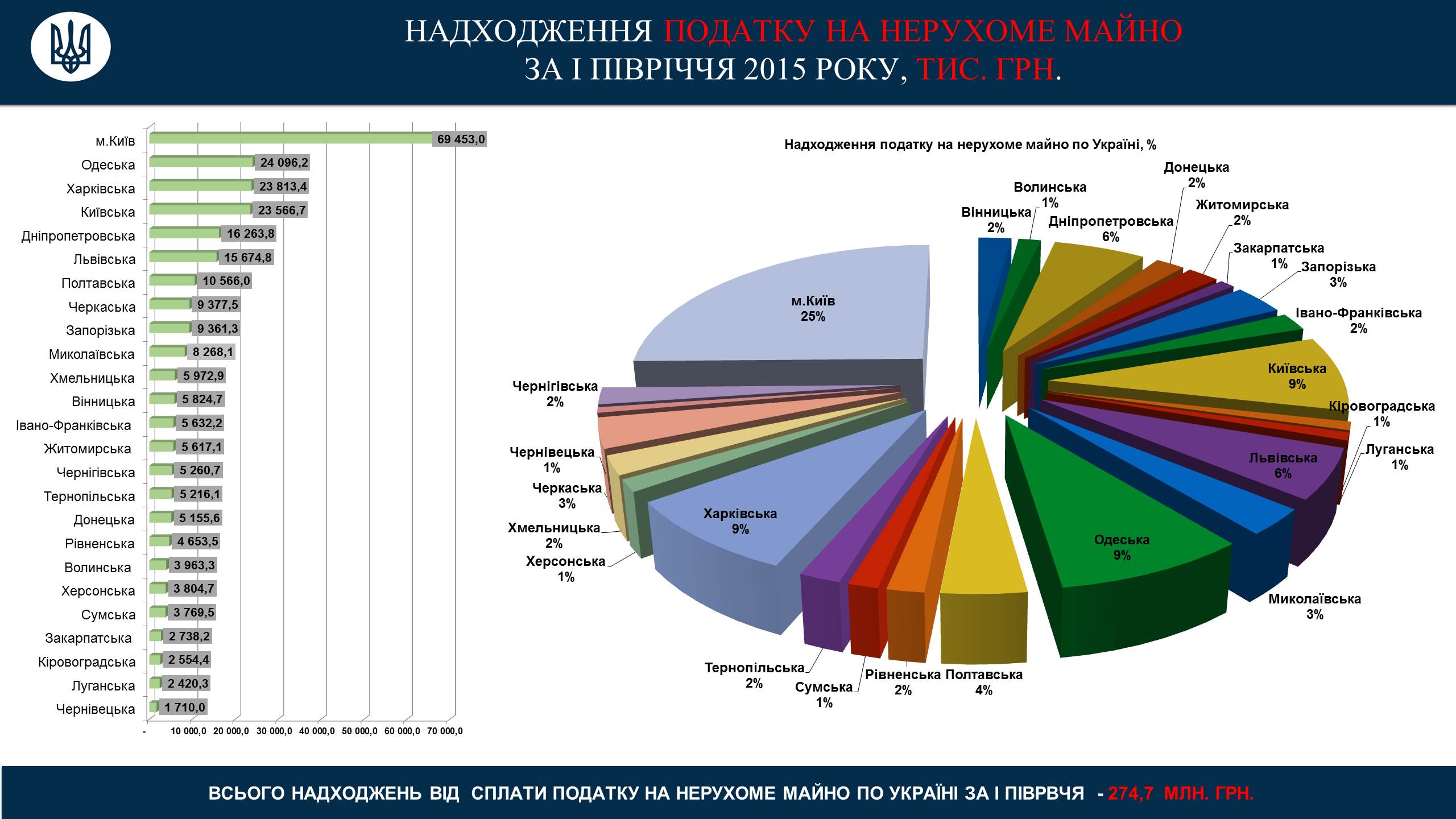 Надходження податку на нерухоме майно на 2015 рік затверджені місцевими радами в обсязі 226,2 млн. грн. Фактичні надходження податку за січень-червень поточного року склали 274,7 млн. грн.
