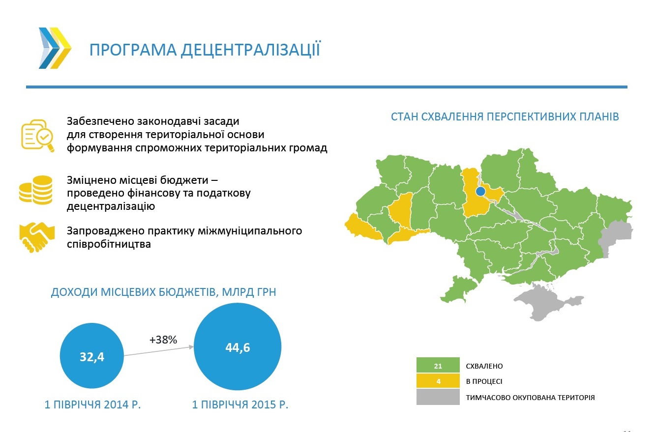 Віце-прем'єр-міністр України нагадав про передачу додаткових фінансових та податкових можливостей, які дозволили зміцнити місцеві бюджети. «Доходи місцевих бюджетів збільшились на 38% і за перше півріччя 2015 року склали 44,6 млрд. грн.», - зазначив він.