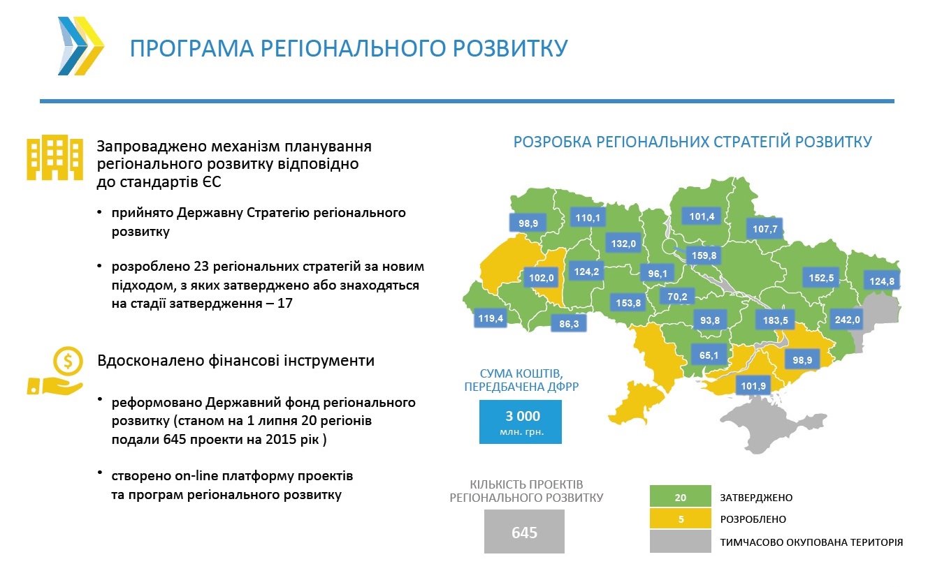 За його словами, всі області, які мають відповідне бачення розвитку своєї території, представили свої інвестиційні програми та проекти. На даний час на відкритій он-лайн платформі Державного фонду регіонального розвитку зареєстровано 645 таких проектів, які планують завершити до кінця 2015 року.