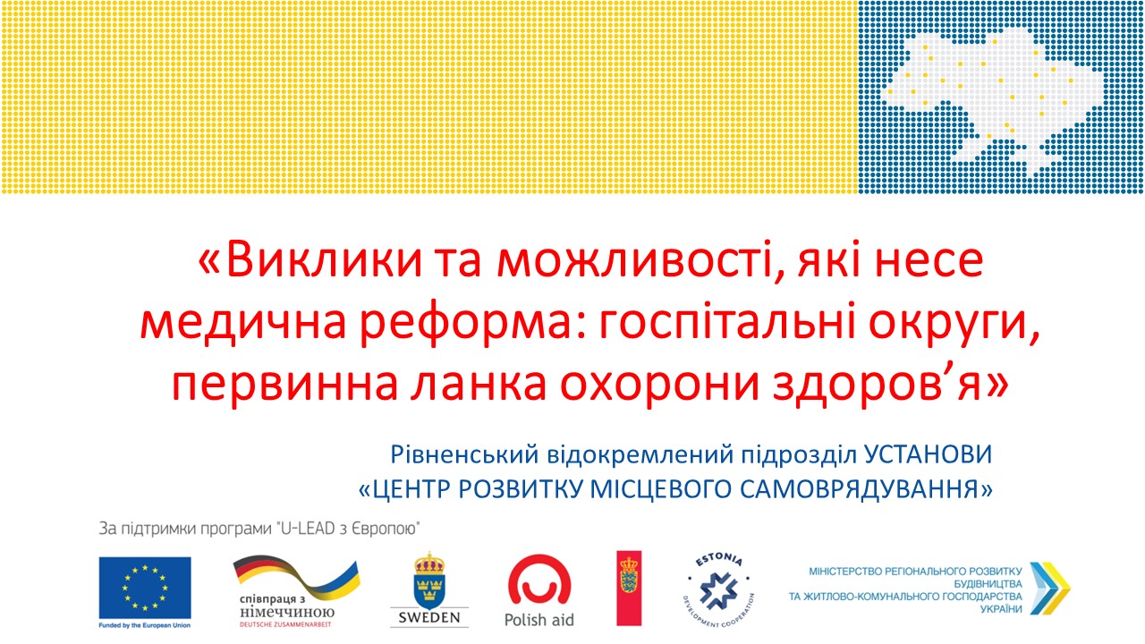 На початку заходу заступники голови Рівненської обласної державної адміністрації Світлана Богатирчук-Кривко та Ігор Тимошенко коротко поінформували присутніх про те, що саме зроблено в області на шляху реформування медичної галузі. Так, фактично завершився процес делегування від місцевих рад представників у Госпітальні ради трьох госпітальних округів. Одна з них, Сарненська, вже навіть провела перше засідання і визначилась зі своїм керівництвом. Дубенська та Рівненська госпітальні ради теж скоро доформуються.