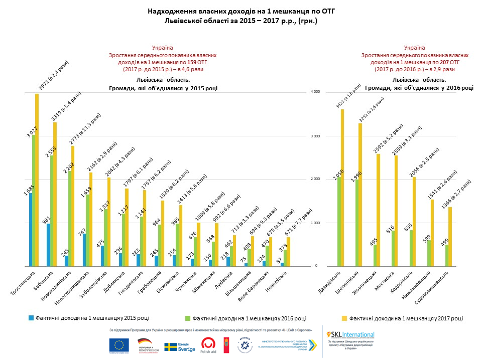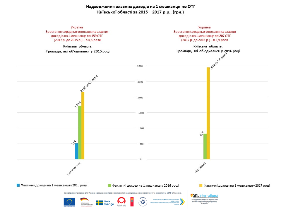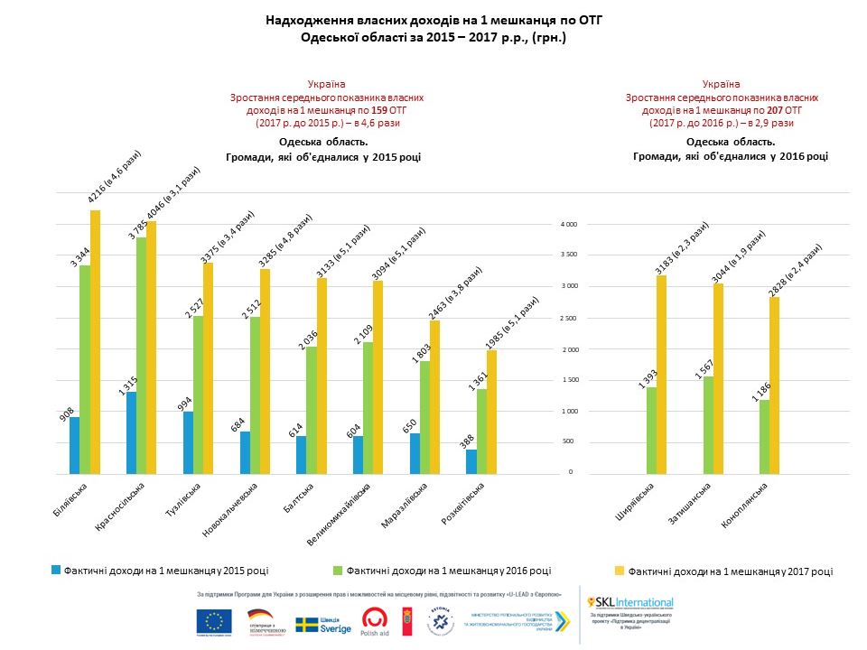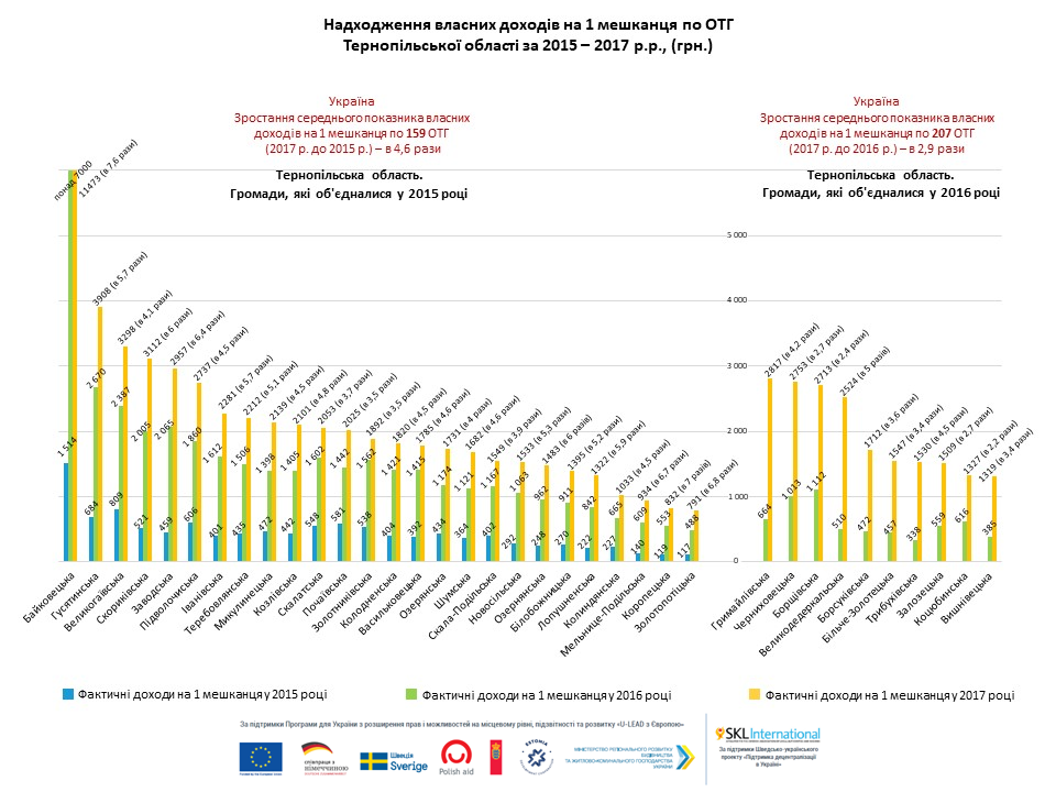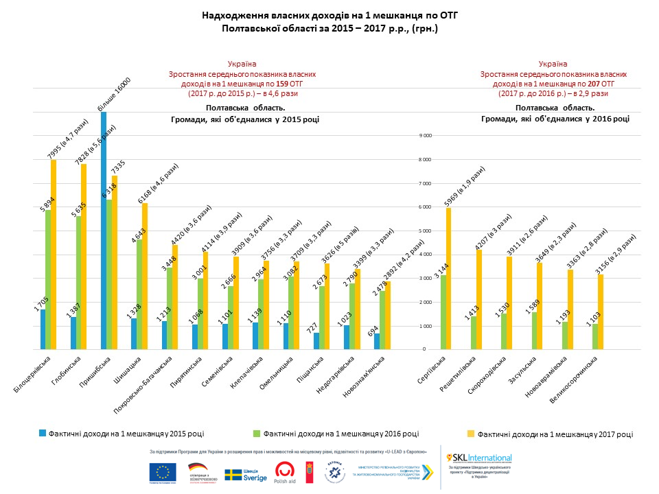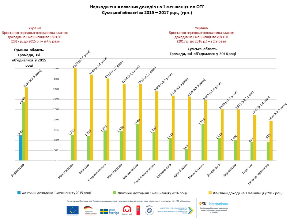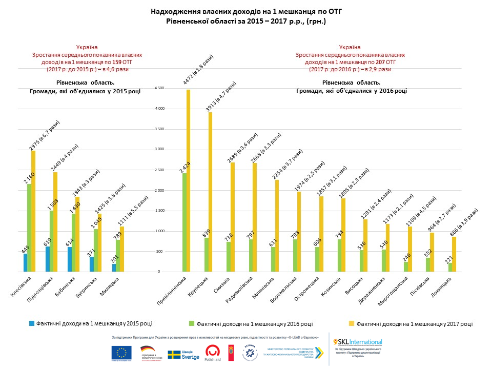 Regarding 207 hromadas that amalgamated in 2016, their own budget revenues amounted to UAH 4.9 billion in 2017 – UAH 2844.3 per capita (2.9 times higher than that of 2016).