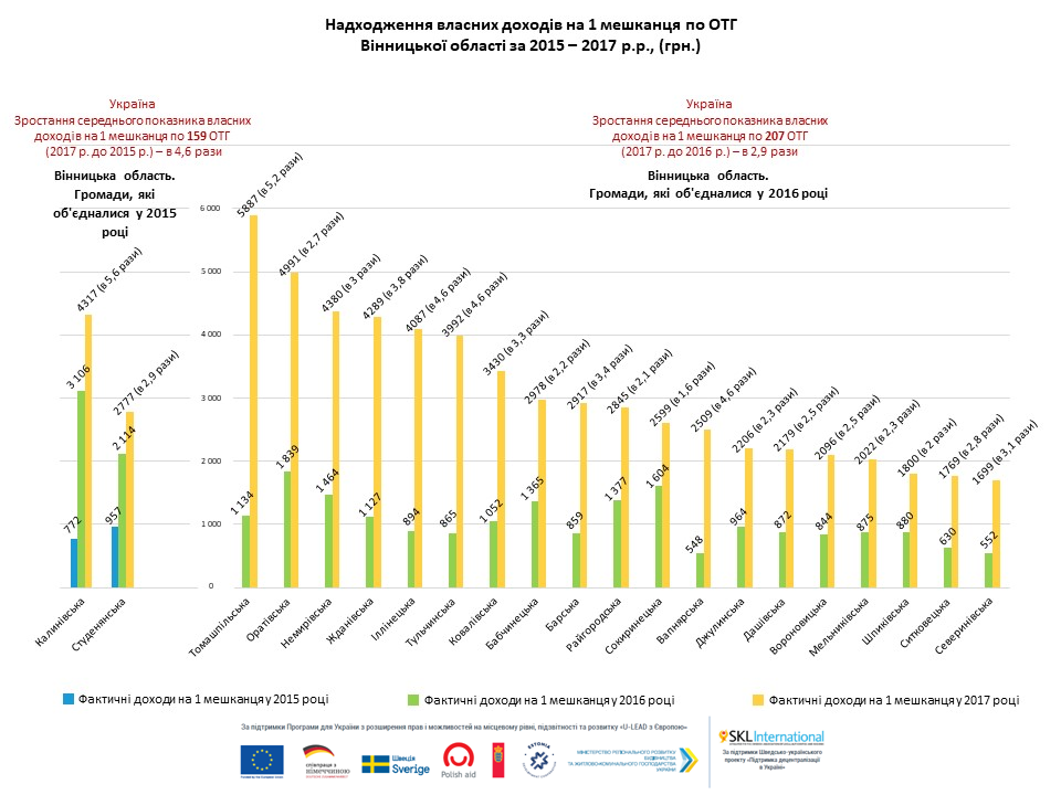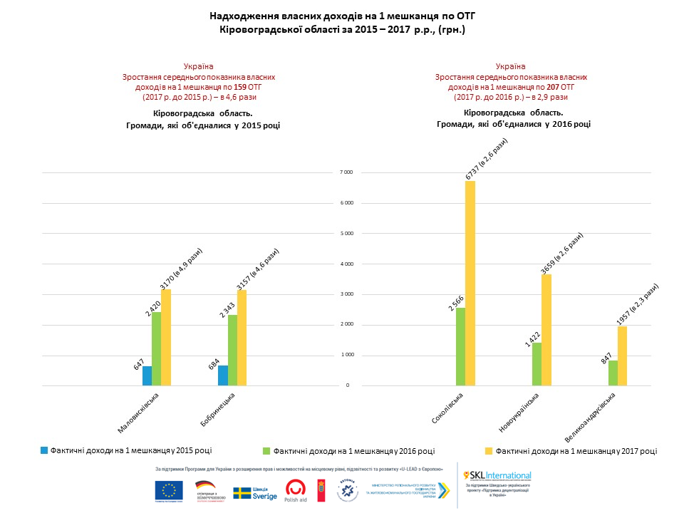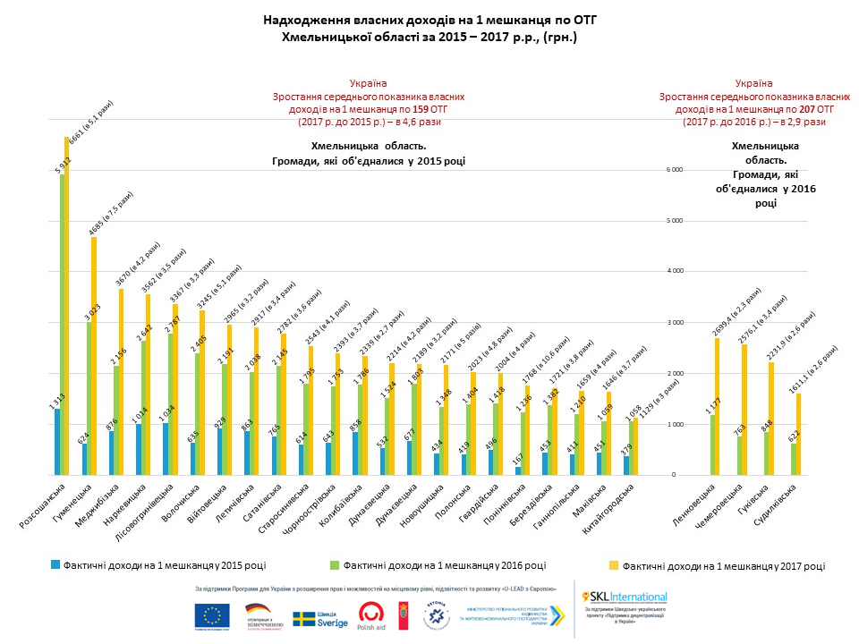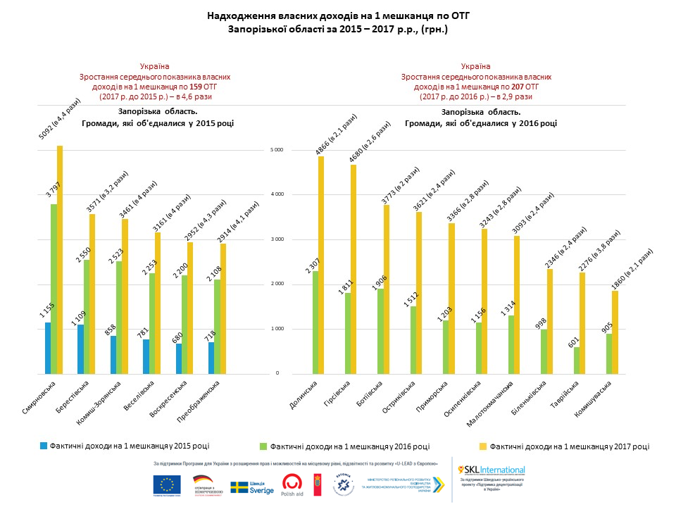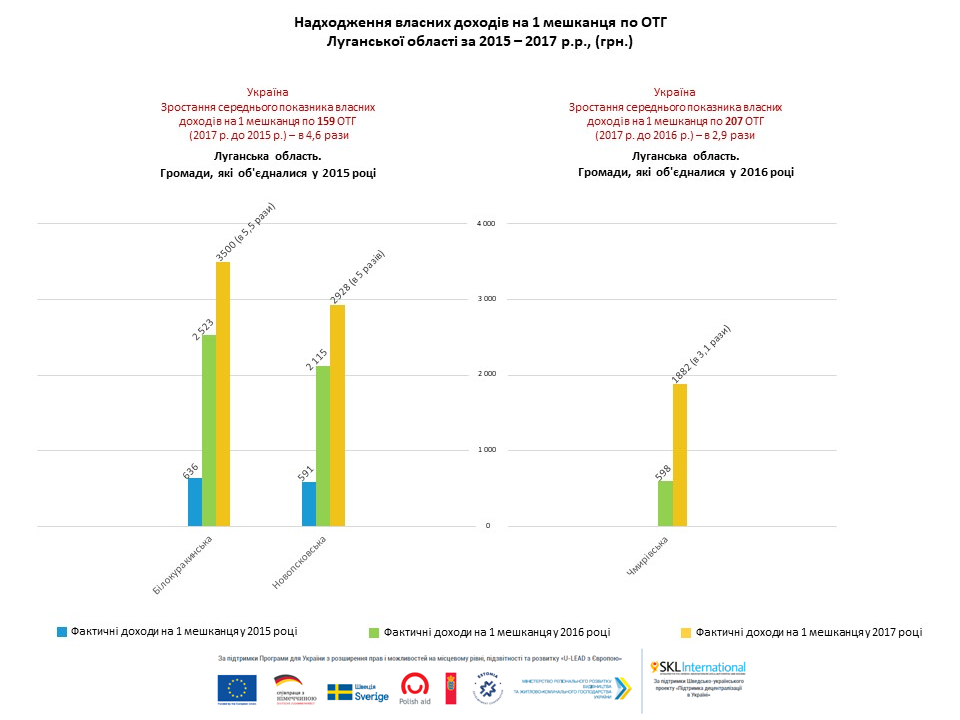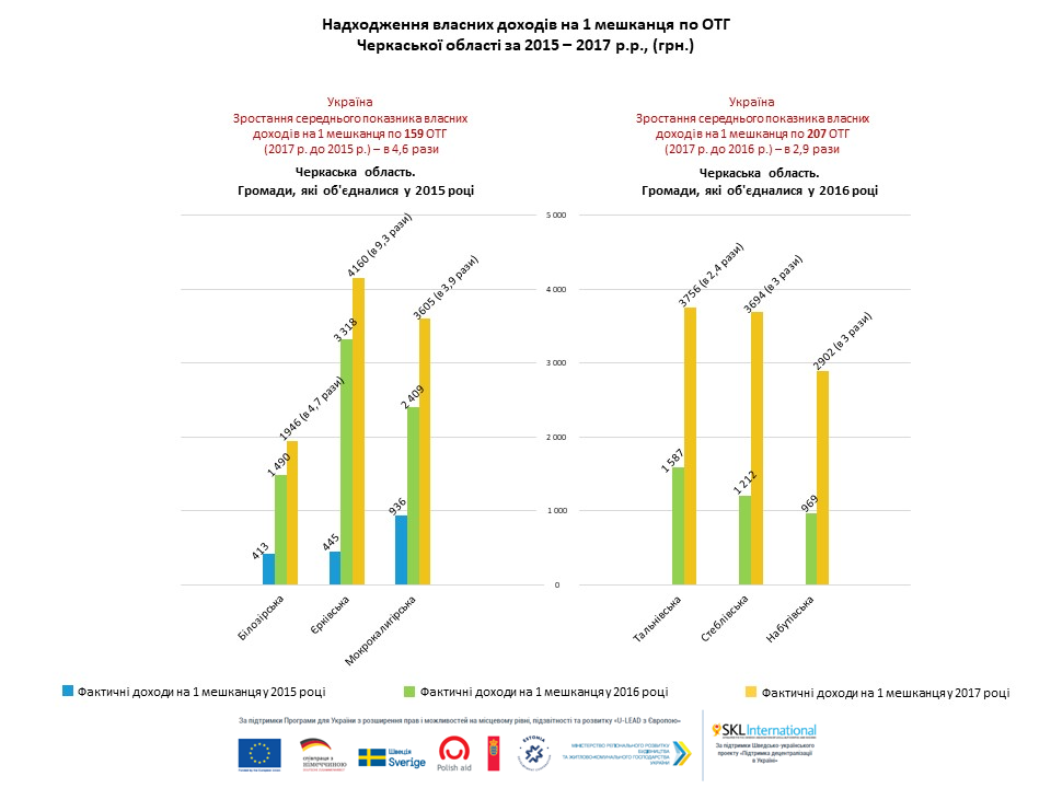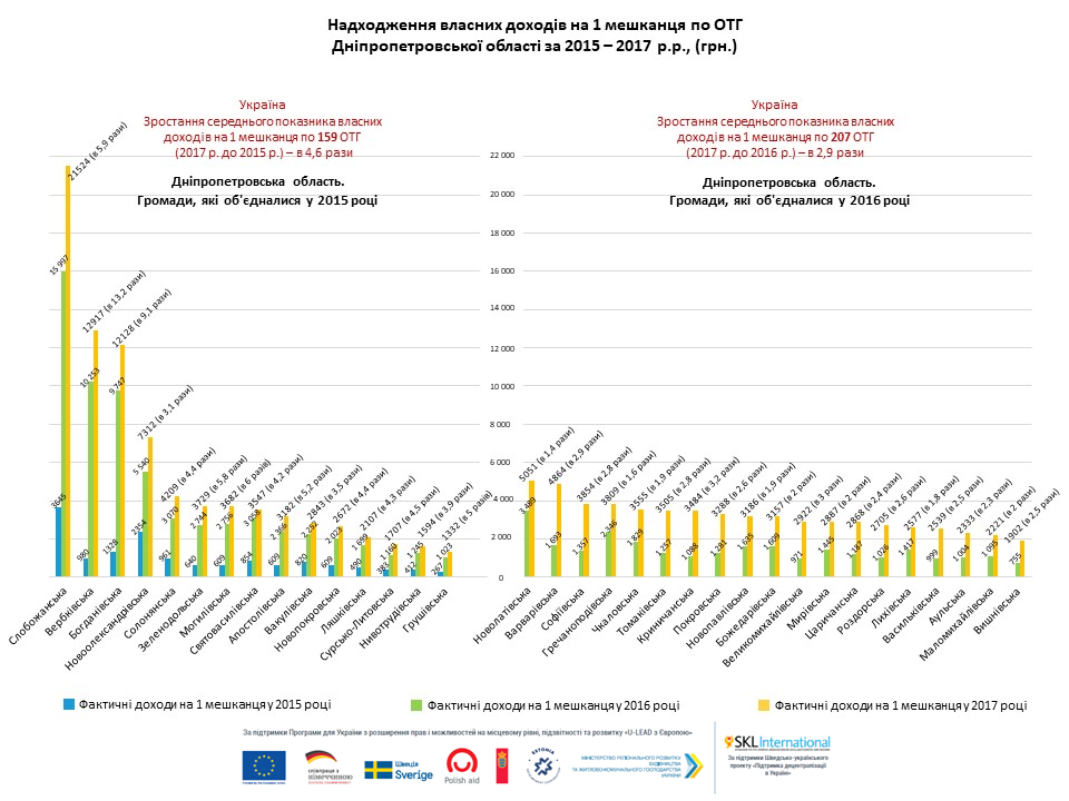Regarding 207 hromadas that amalgamated in 2016, their own budget revenues amounted to UAH 4.9 billion in 2017 – UAH 2844.3 per capita (2.9 times higher than that of 2016).