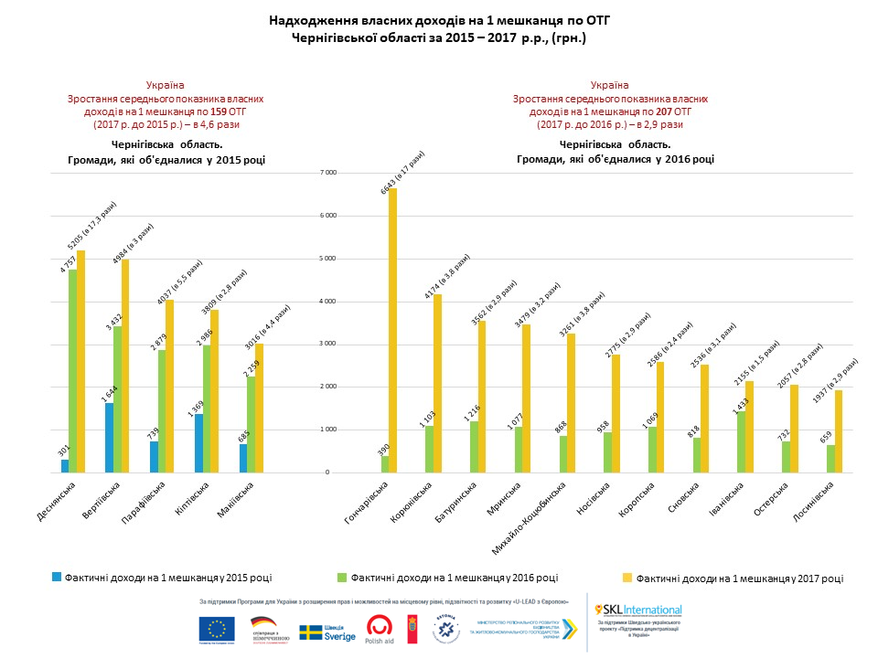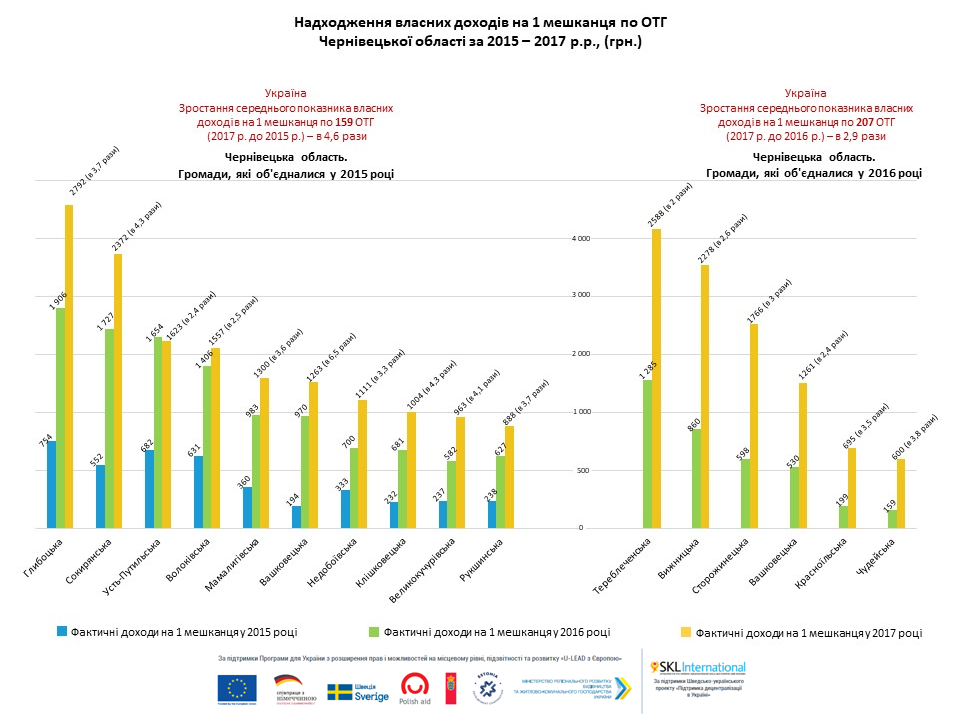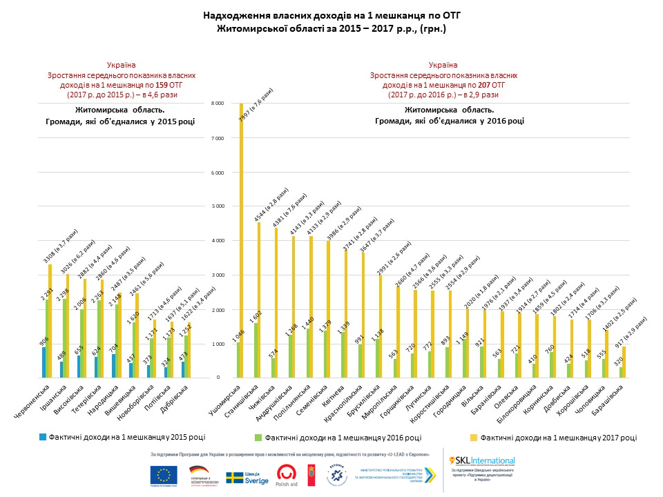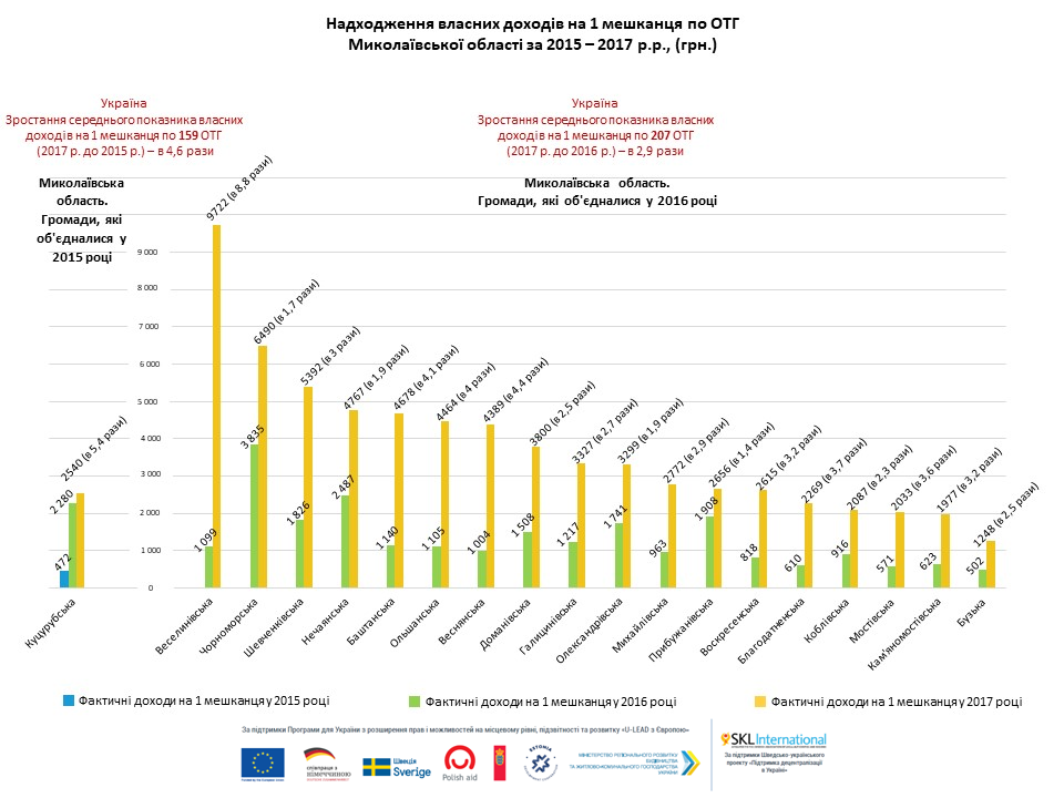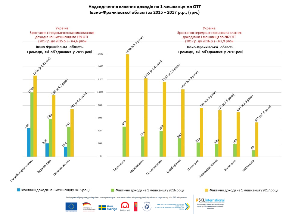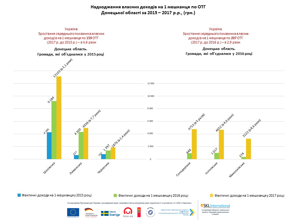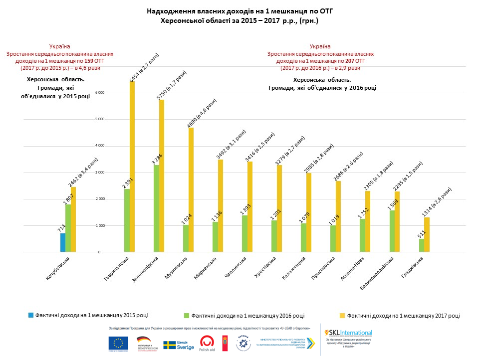 Regarding 207 hromadas that amalgamated in 2016, their own budget revenues amounted to UAH 4.9 billion in 2017 – UAH 2844.3 per capita (2.9 times higher than that of 2016).