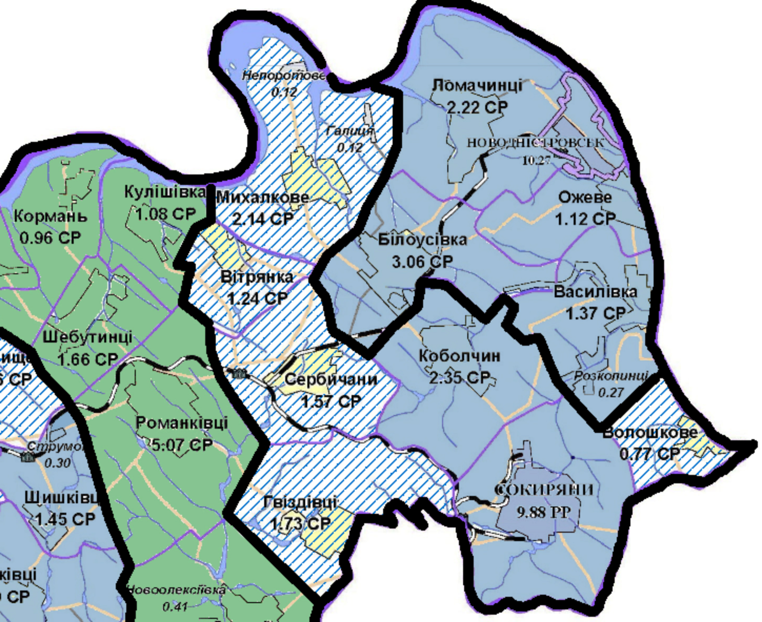 Pursuant to the current map of AHs of the Chernivtsi Oblast, the Novodnistrovska AH includes Novodnistrovsk city and the villages of Lomachyntsi, Bilousivka, Ozheve and Vasylivka (this village council also comprises the village of Roskopyntsi).