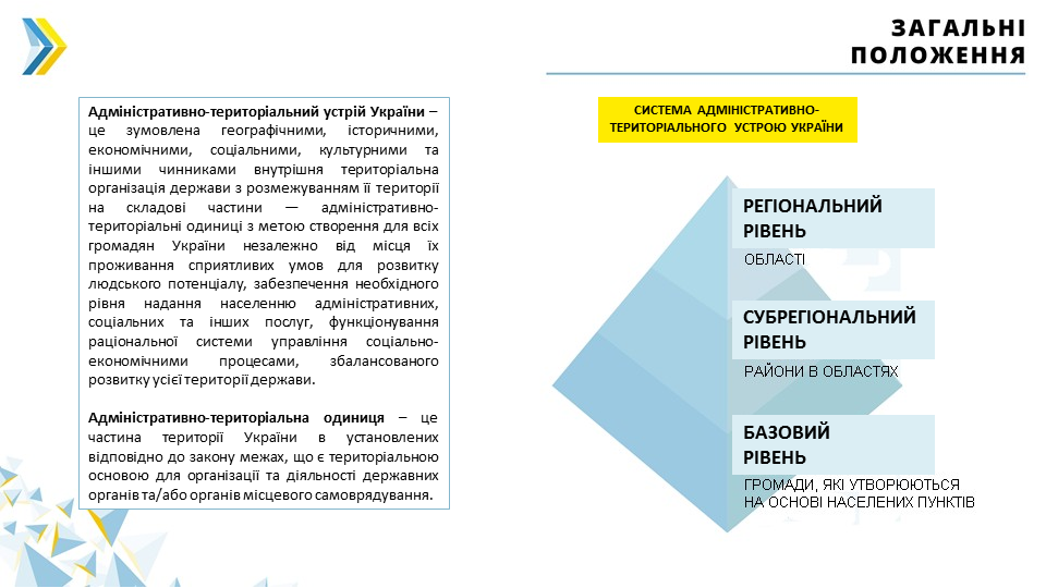 In particular, the draft law defines the notion of administrative and territorial structure, administrative and territorial units and their levels, settlements and their categories, and determines the procedure for the formation, liquidation, establishment and change of the borders of administrative and territorial units and settlements, etc.
