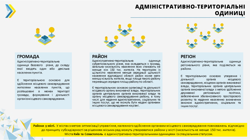The draft law more clearly defines the notion of “hromada” as an administrative and territorial unit of the basic level, consisting of one or several settlements and land outside their borders.