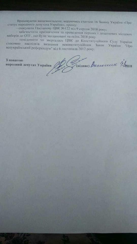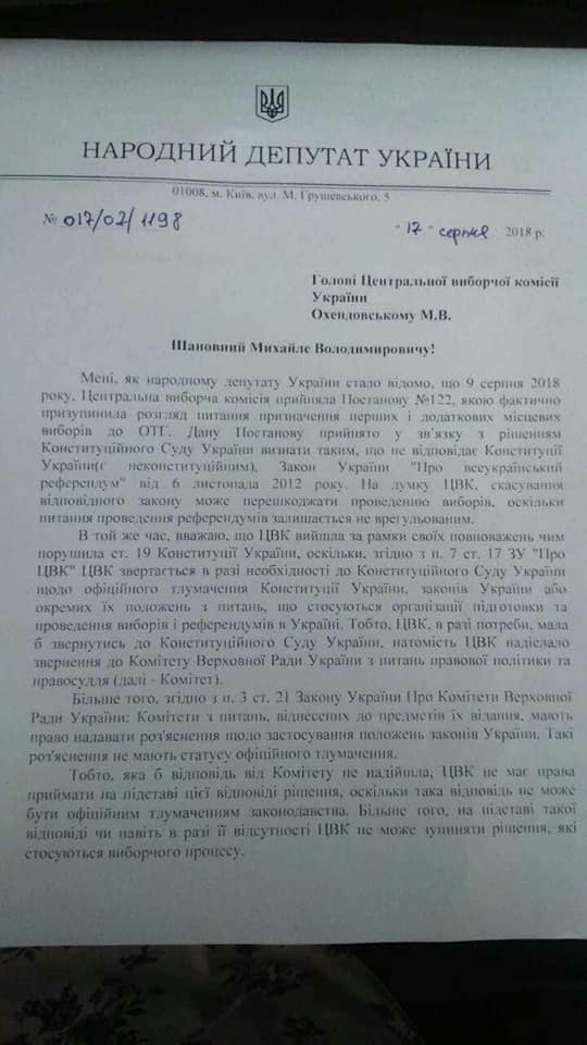 According to MP Ihor Vasyunyk, the Central Election Commission, having adopted its Resolution on 9 August, which made it impossible to appoint elections in amalgamated hromadas for October 2018, went beyond its powers and violated the Constitution of Ukraine.