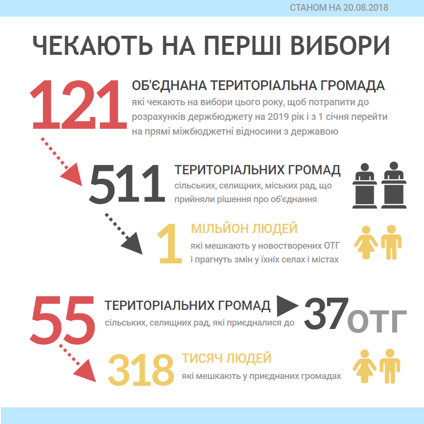 Already 121 amalgamated hromadas (AHs) are waiting for the appointment of the first elections of hromadas’ heads and local deputies by the Central Election Commission.These AHs include 511 hromadas of village, urban-type settlement and city councils. Another 55 hromadas have joined 37 of the existing AHs and are also ready for the elections.