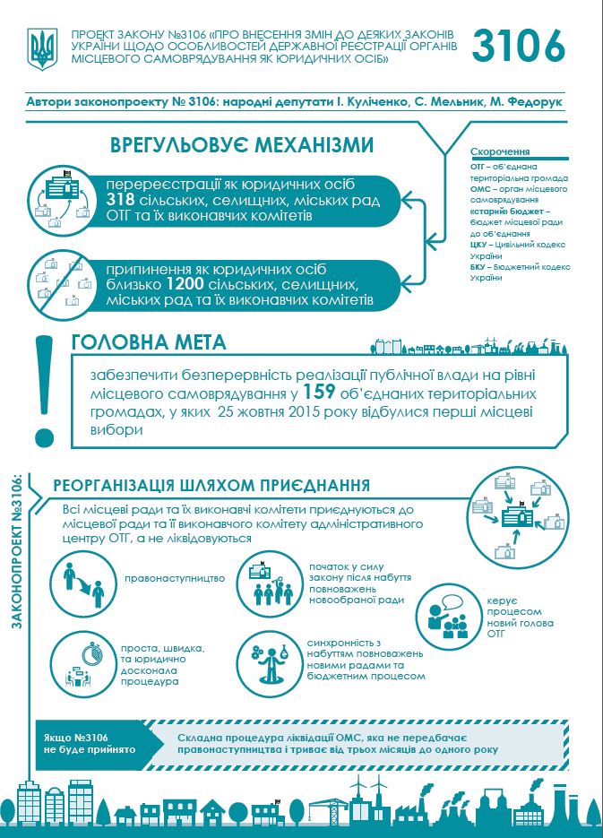 Проект Закону України №3106 передбачає доповнення Закону України «Про державну реєстрацію юридичних осіб та фізичних осіб-підприємців» новою статтею 24-2, а також внесення змін до статей 7, 8, 10 Закону України «Про добровільне об’єднання територіальних громад».