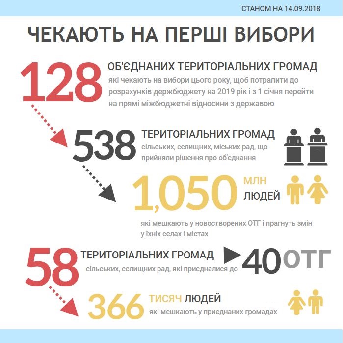 128 amalgamated hromadas (AHs) are ready for the first elections of local heads and deputies. These AHs include 538 hromadas – village, settlement, city councils. 58 hromadas with a total population of 1 million 417 thousand people, that joined 40 already established AHs, are waiting for the elections.