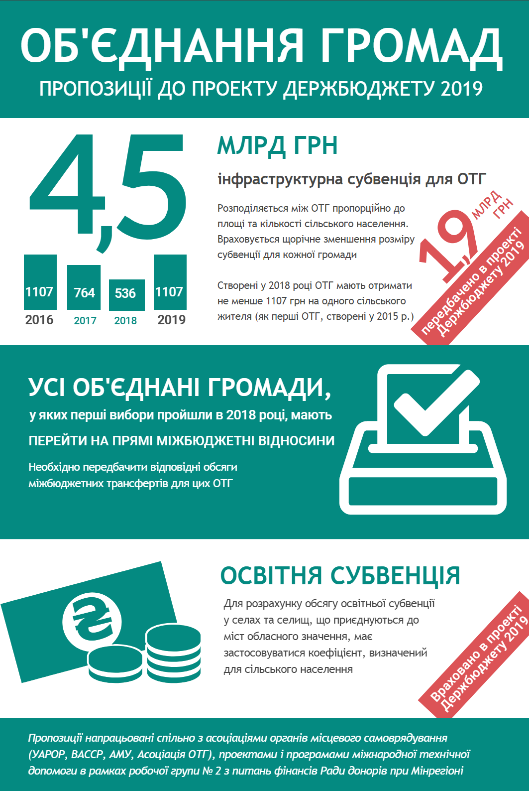 “The 2019 State Budget, presented today in the Verkhovna Rada, considers the proposal regarding the educational subvention. The infrastructure subvention is foreseen only in the amount of UAH 1.9 billion, since amalgamated hromadas and accessed hromadas, where elections are not yet scheduled, were not included in the calculations. I hope that the issue with the elections will soon be resolved by new members of the Central Election Commission, appointed yesterday, and the Parliament together with the Government will find it possible to increase the size of state support to AHs to the level that will meet hromadas’ expectations,” said Yanina Kazyuk.