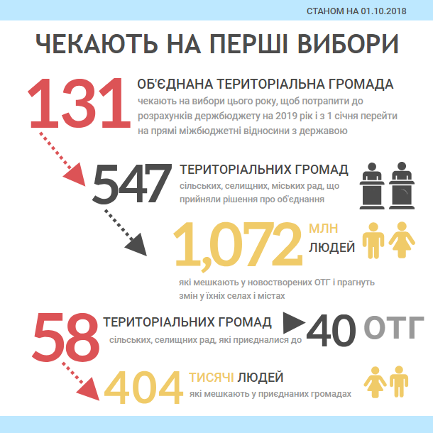 131 amalgamated hromadas (AHs) are ready for the first elections of local heads and deputies. These AHs include 547 hromadas – village, settlement, city councils. 58 hromadas with a total population of 1 million 477 thousand people, that joined 40 already established AHs, are waiting for the elections.
