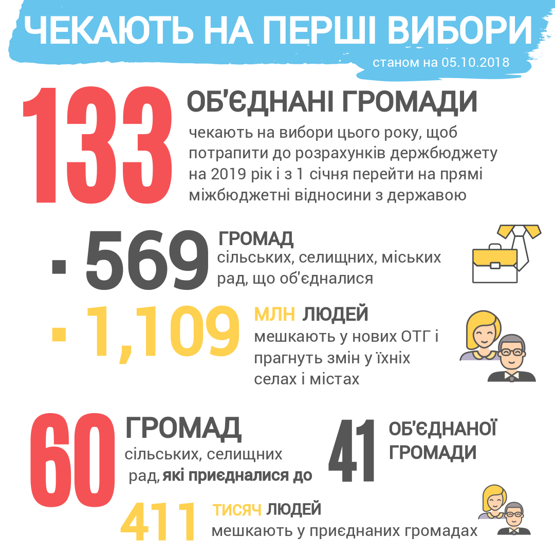 As of 5 October, 133 amalgamated hromadas are ready for the first elections of local heads and deputies. These AHs include 569 hromadas of village, settlement, city councils. There are 60 hromadas waiting for the elections to join the 41 already established AHs. The total population of these hromadas is 1 million 519 thousand people.