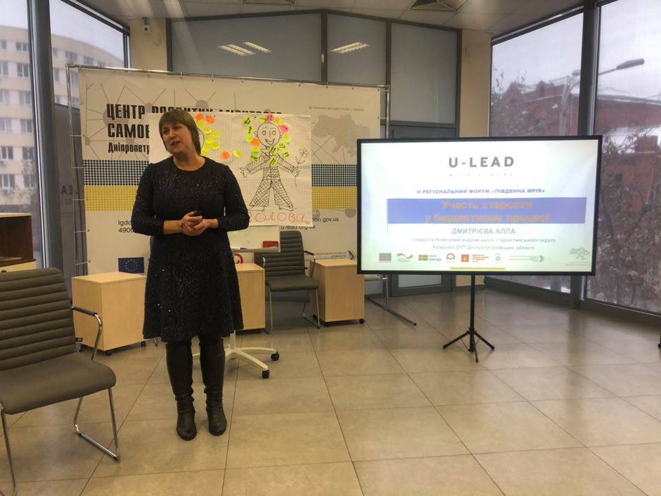 Олена Тертишна, директорка Дніпропетровського ЦРМС, презентувала концепцію «План дій старости: «12 кроків успішного старту». Застосувавши цю методологію, старости новоутворених громад швидше досягнуть успіху, наголошує вона.