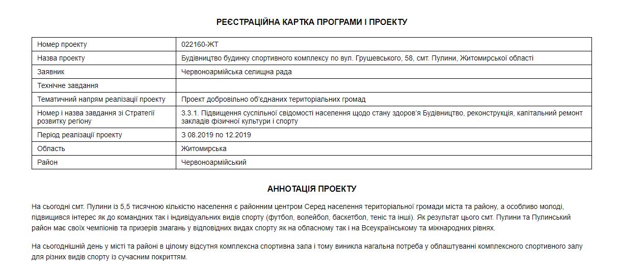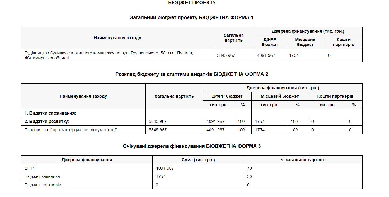 На онлайн платформі Державного фонду регіонального розвитку можна ознайомитись з усіма проектами, що вже були подані громадами регіону. Зокрема, проект Пулинської селищної ради передбачає будівництво сучасного приміщення для проведення навчально-тренувальних занять та змагань з ігрових видів спорту в селищі Пулини для молоді міста та району. Вартість об’єкту становить 5,8 млн гривень, із яких 4 надає ДФРР, а 1,7 – бюджет громади.