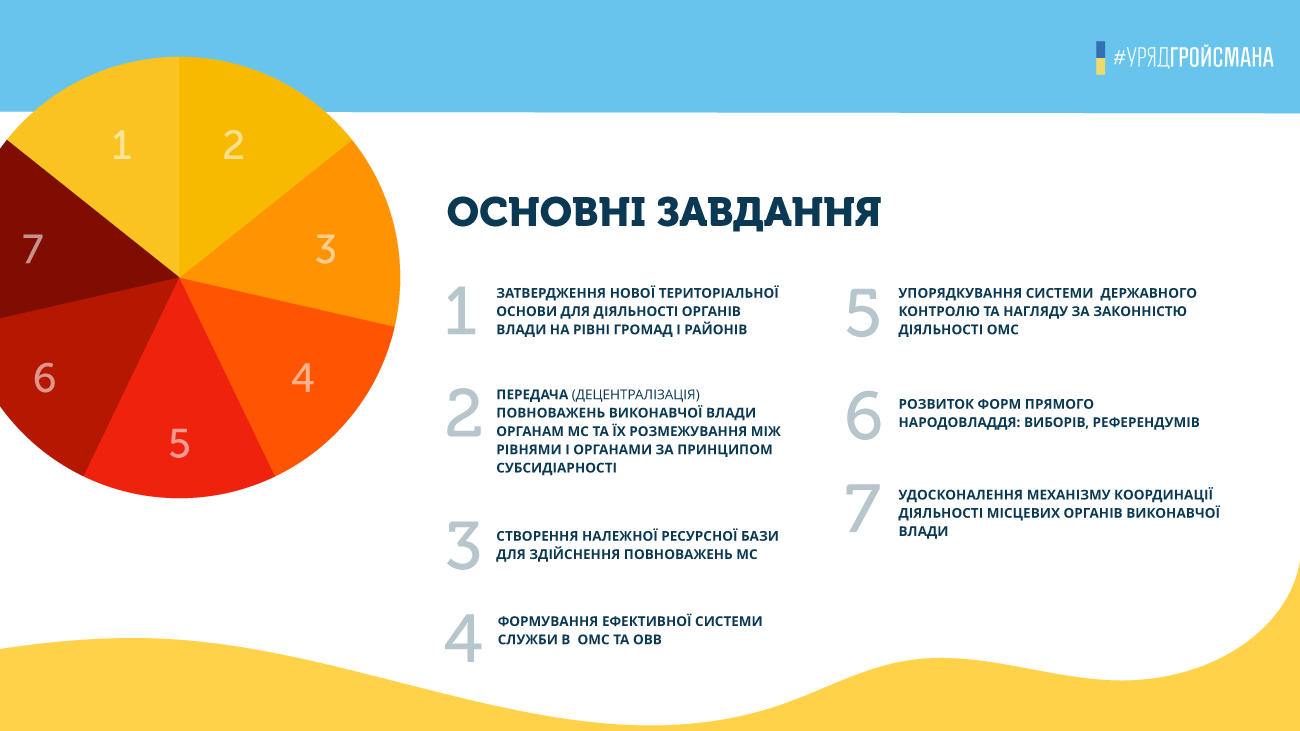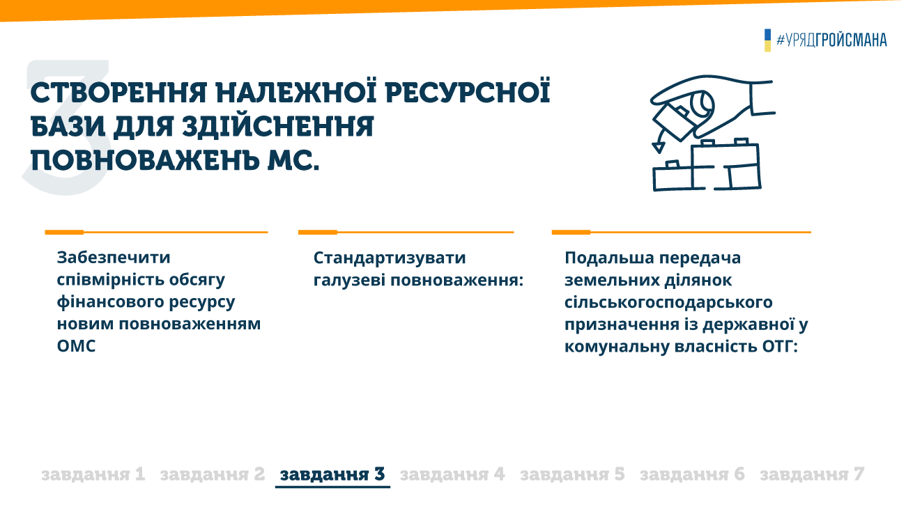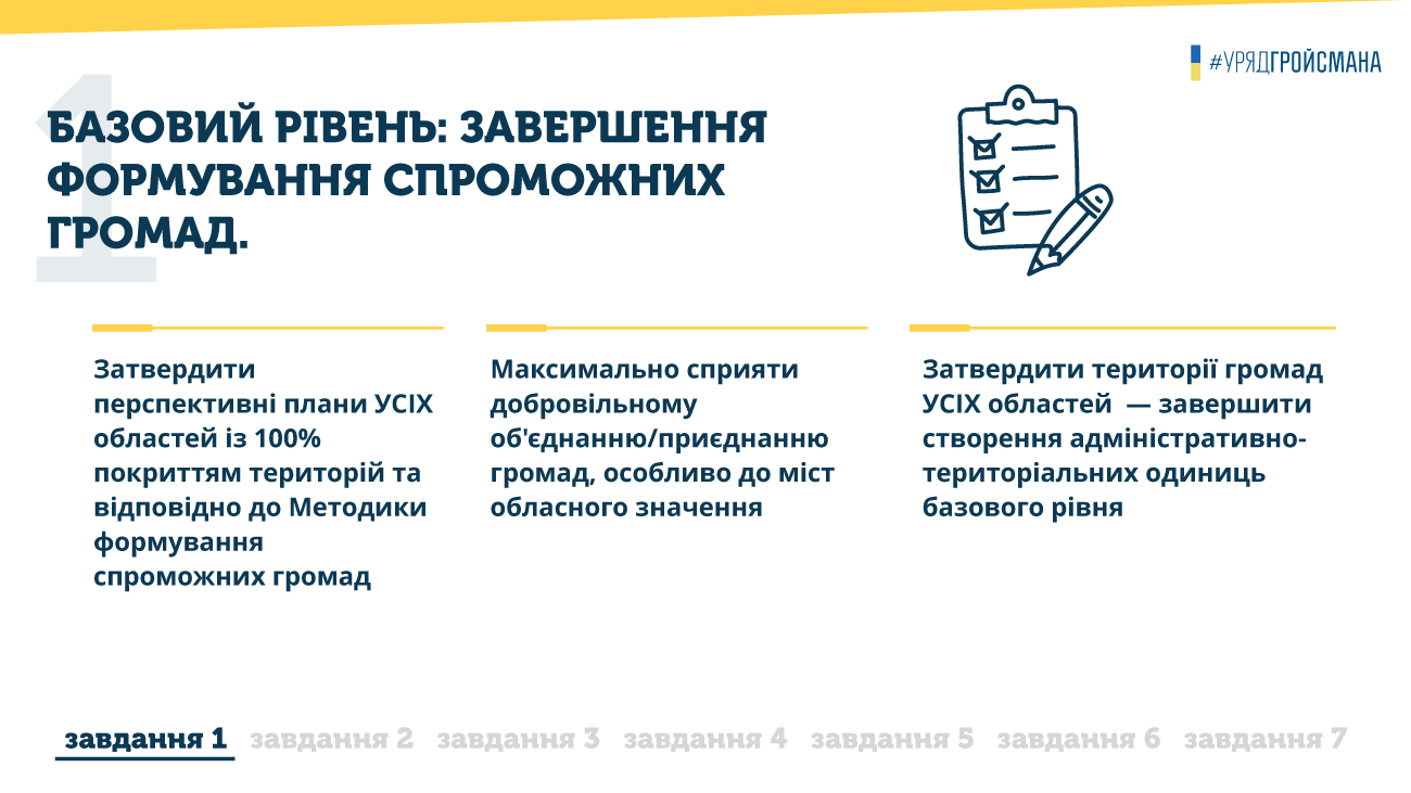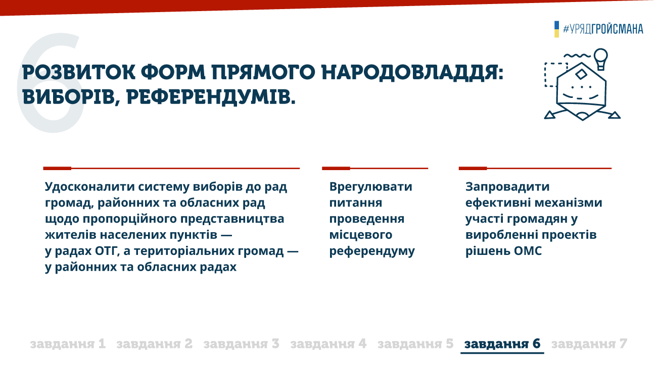 В числі таких рішень, як пояснив Глава Уряду, - закріплення фінансової стійкості громад, закріплення принципів народовладдя в частині виборів та місцевих референдумів, закріплення координації органів влади на рівні «центр – регіони», в тому числі, в сегменті повноважень, а також формування нового територіального устрою за формулою «громада – район – регіон».