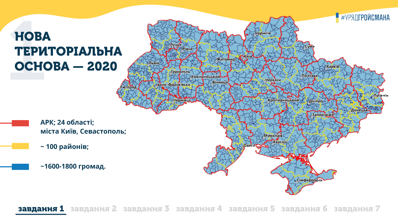 Реформа децентралізації в Україні впроваджується з квітня 2014 року. Відтоді ухвалено декілька законодавчих актів, які закріплюють адміністративні повноваження та фінансові можливості громад. Наразі в Україні сформовано вже 874 ОТГ, в частині з яких мають пройти перші вибори. У 18 районах ОТГ сформовані на 100%. Разом з тим є 99 районів, де немає жодної об’єднаної громади. Прямі міжбюджетні відносини мають 665 громад. Доходи їх бюджетів за 11 місяців поточного року склали 18,9 млрд грн. В ОТГ створено 123 центри надання адміністративних послуг, перелік яких обчислюється десятками. У таких центрах люди отримують різні довідки, призначають пенсії та субсидії без необхідності їхати в обласний чи районний центр.
