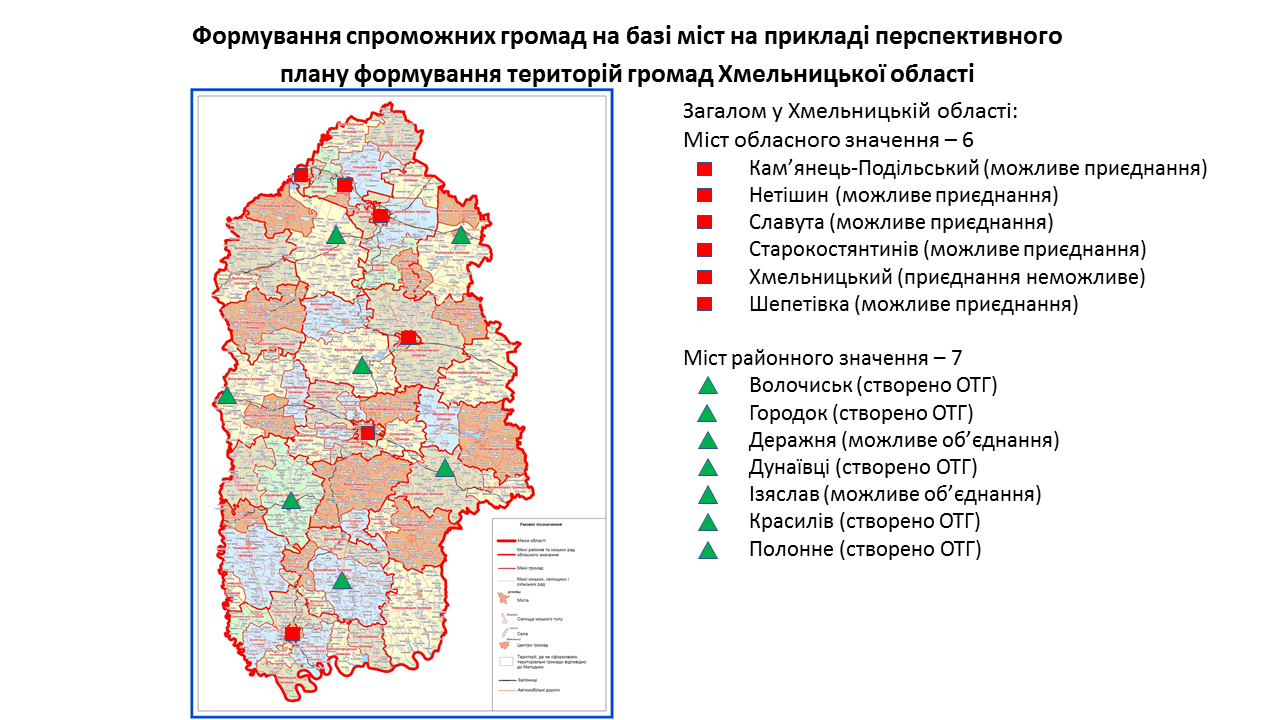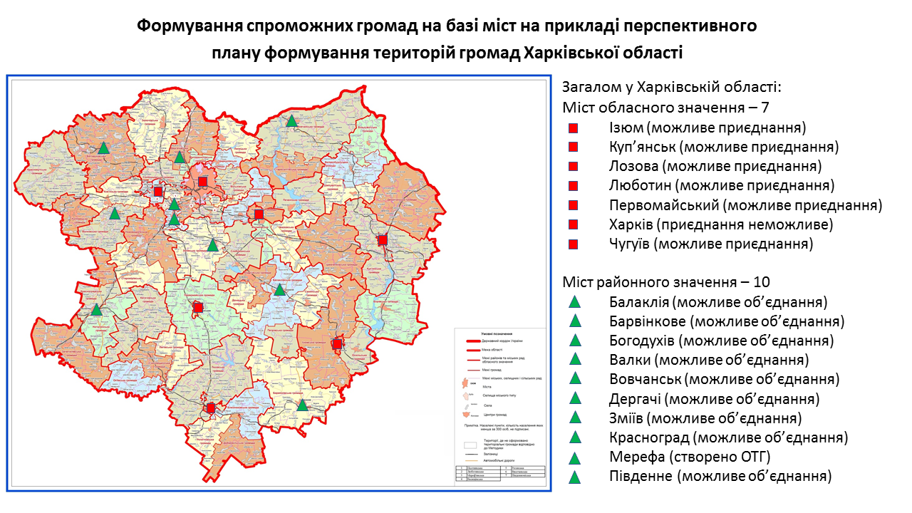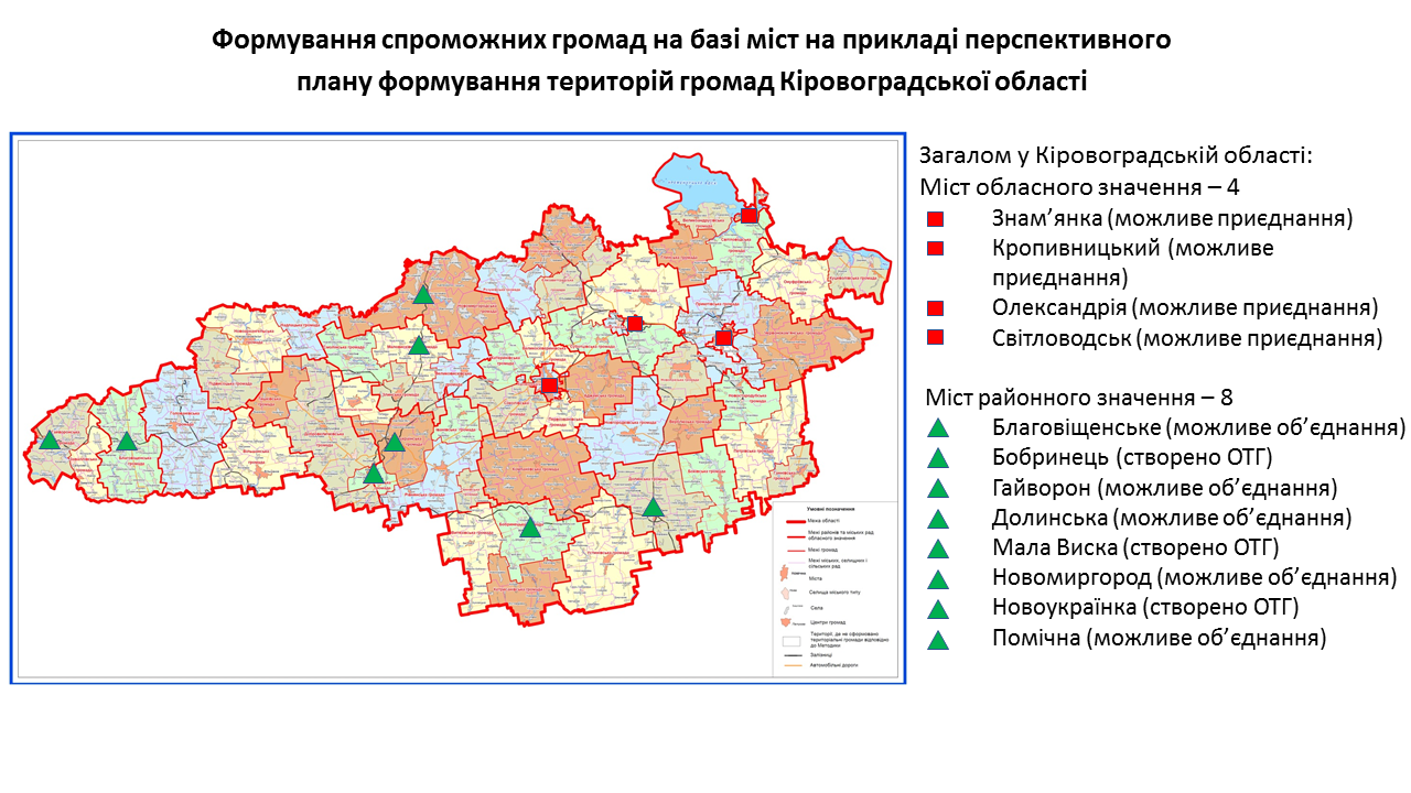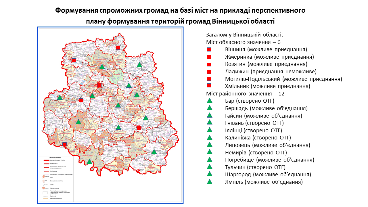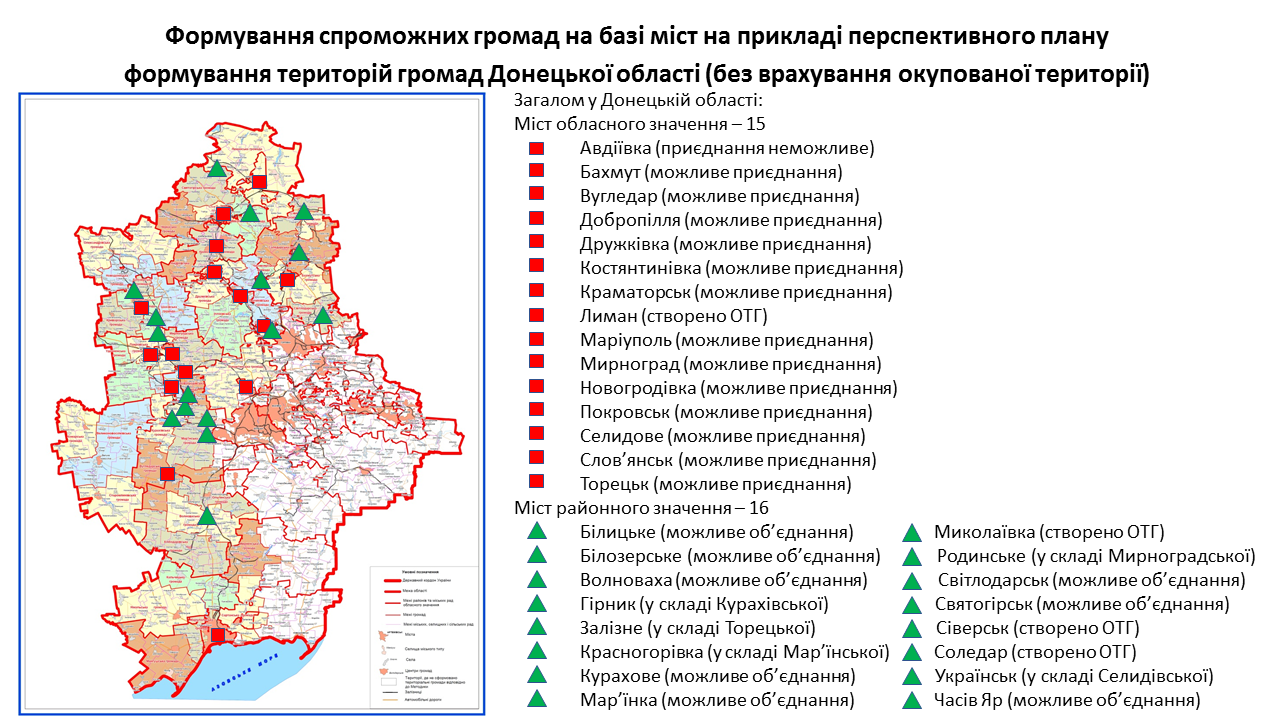 142 міста обласного та 238 міст районного значення передбачені у перспективних планах формування територій громад областей як центри об’єднаних громад. Частина з них вже є центрами громад, частина – у процесі створення ОТГ. Деякі міста при формуванні областями перспективних планів не були визначені як центри громад. Відповідну графічну інформацію (ЗАВАНТАЖИТИ) щодо формування спроможних громад на базі міст розробили у Мінрегіоні. Розробники спиралися на чинні перспективні плани кожної області.