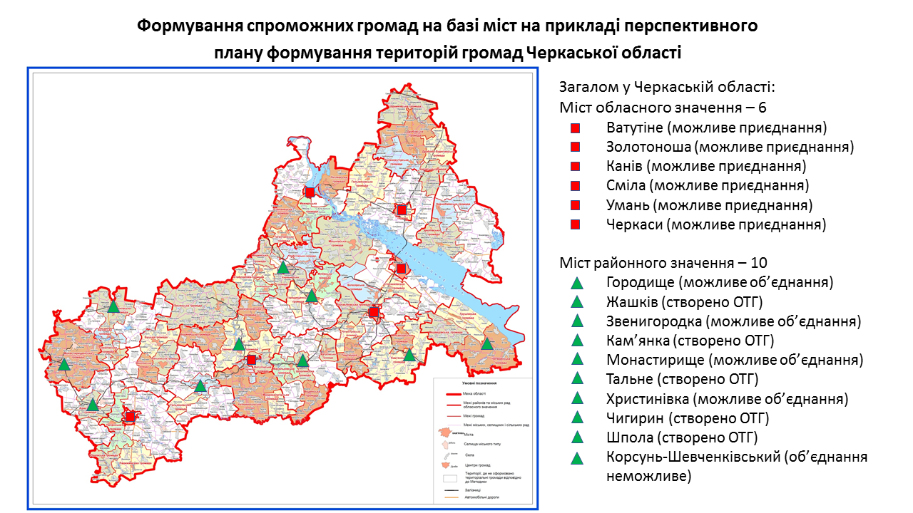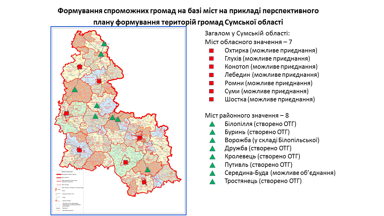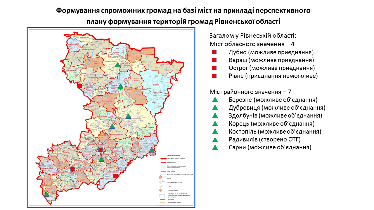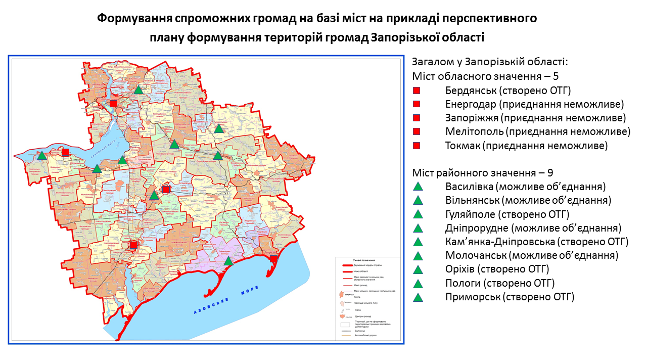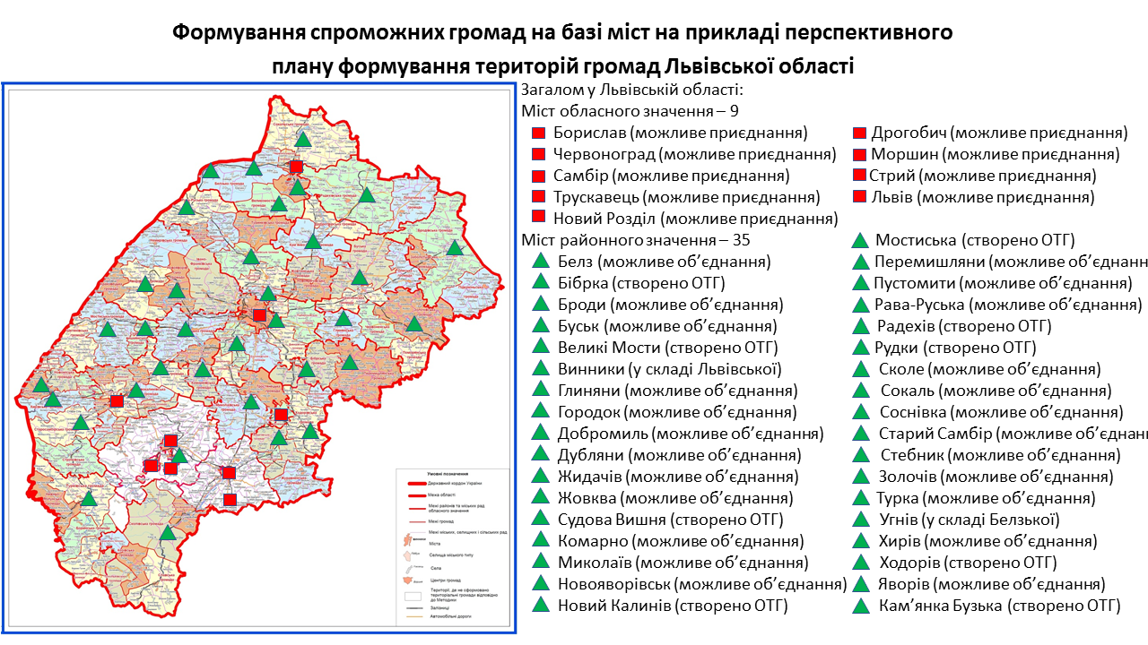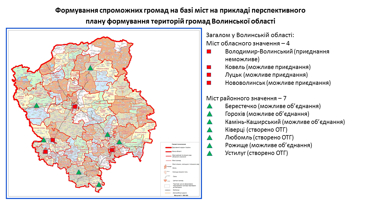 142 міста обласного та 238 міст районного значення передбачені у перспективних планах формування територій громад областей як центри об’єднаних громад. Частина з них вже є центрами громад, частина – у процесі створення ОТГ. Деякі міста при формуванні областями перспективних планів не були визначені як центри громад. Відповідну графічну інформацію (ЗАВАНТАЖИТИ) щодо формування спроможних громад на базі міст розробили у Мінрегіоні. Розробники спиралися на чинні перспективні плани кожної області.