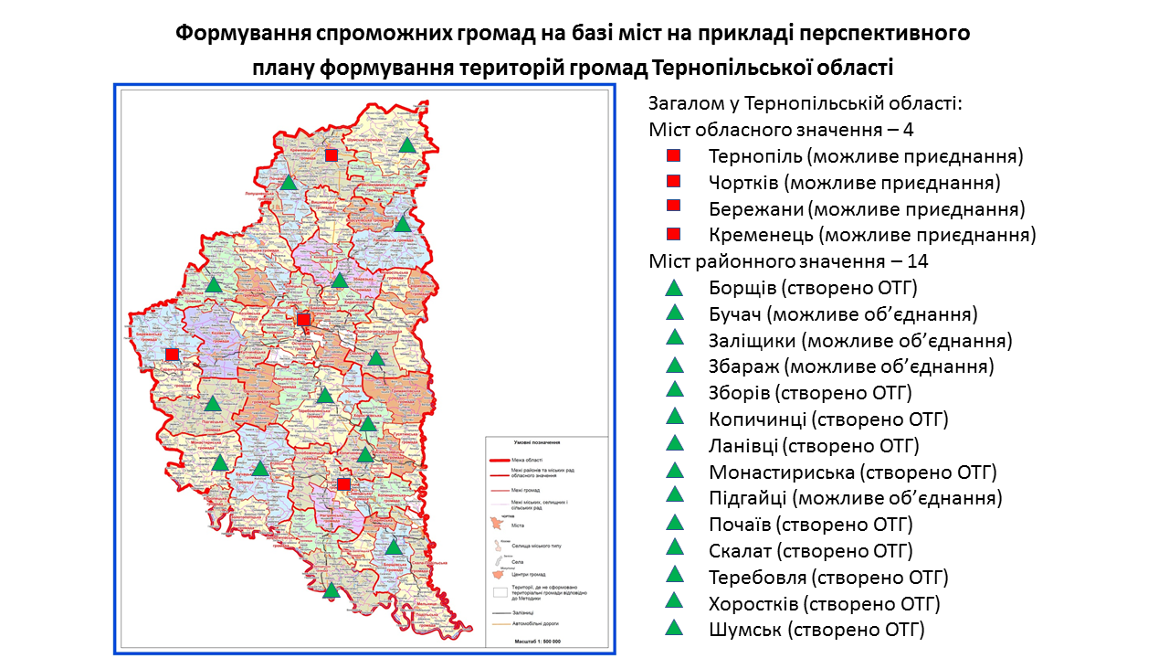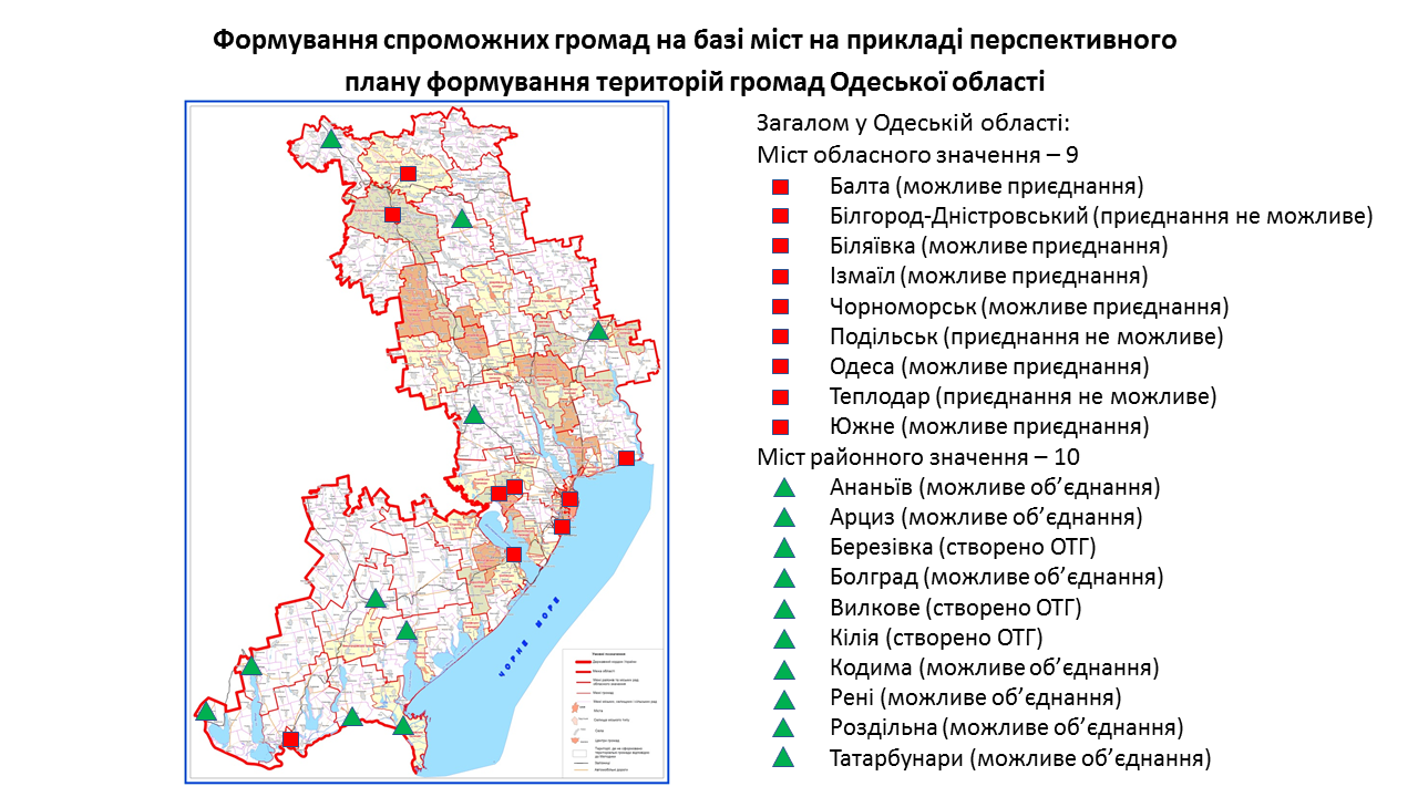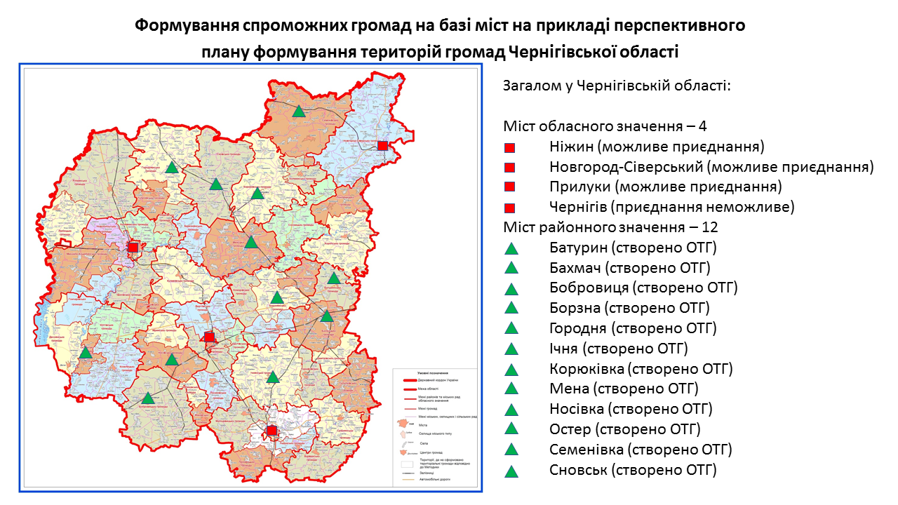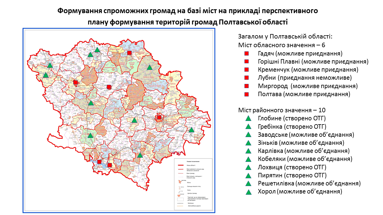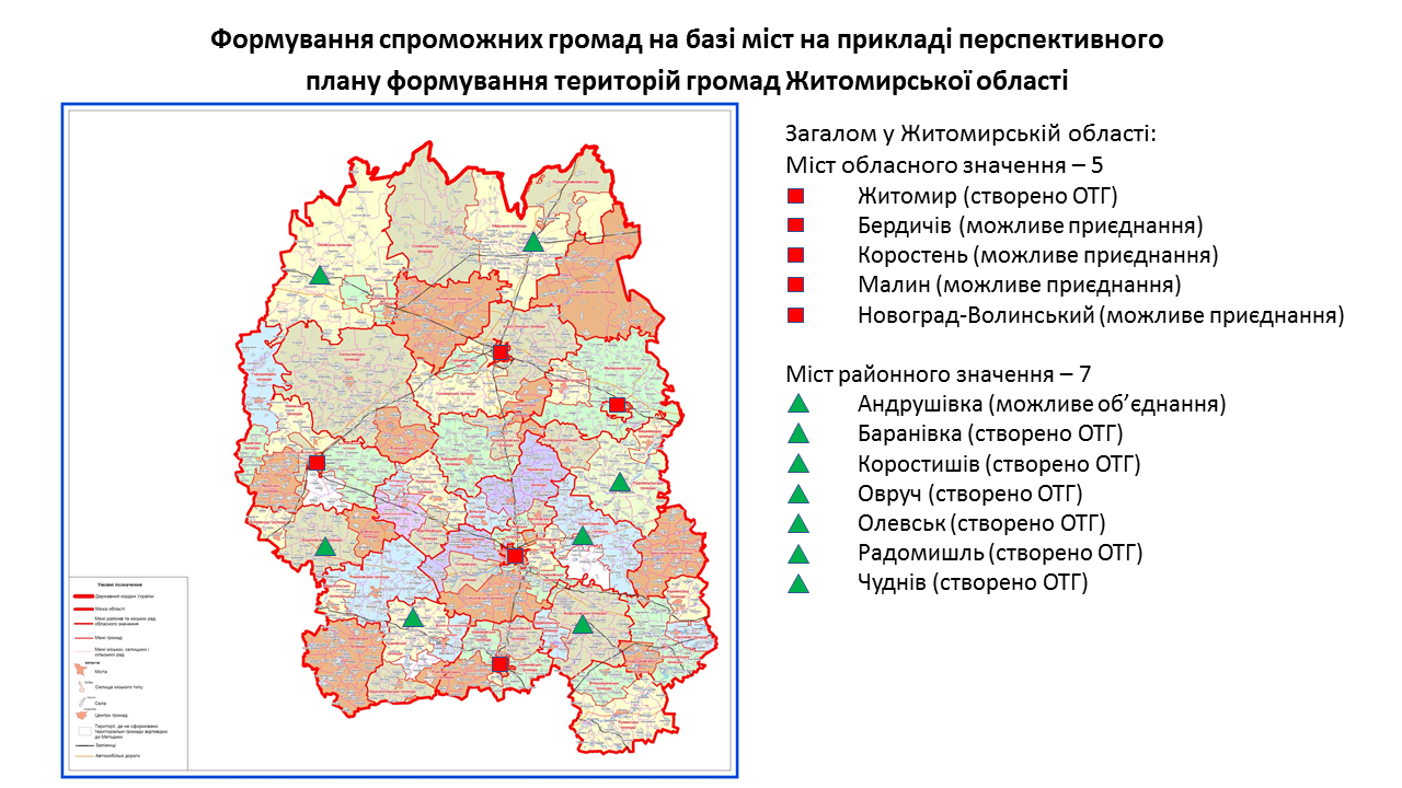 142 міста обласного та 238 міст районного значення передбачені у перспективних планах формування територій громад областей як центри об’єднаних громад. Частина з них вже є центрами громад, частина – у процесі створення ОТГ. Деякі міста при формуванні областями перспективних планів не були визначені як центри громад. Відповідну графічну інформацію (ЗАВАНТАЖИТИ) щодо формування спроможних громад на базі міст розробили у Мінрегіоні. Розробники спиралися на чинні перспективні плани кожної області.