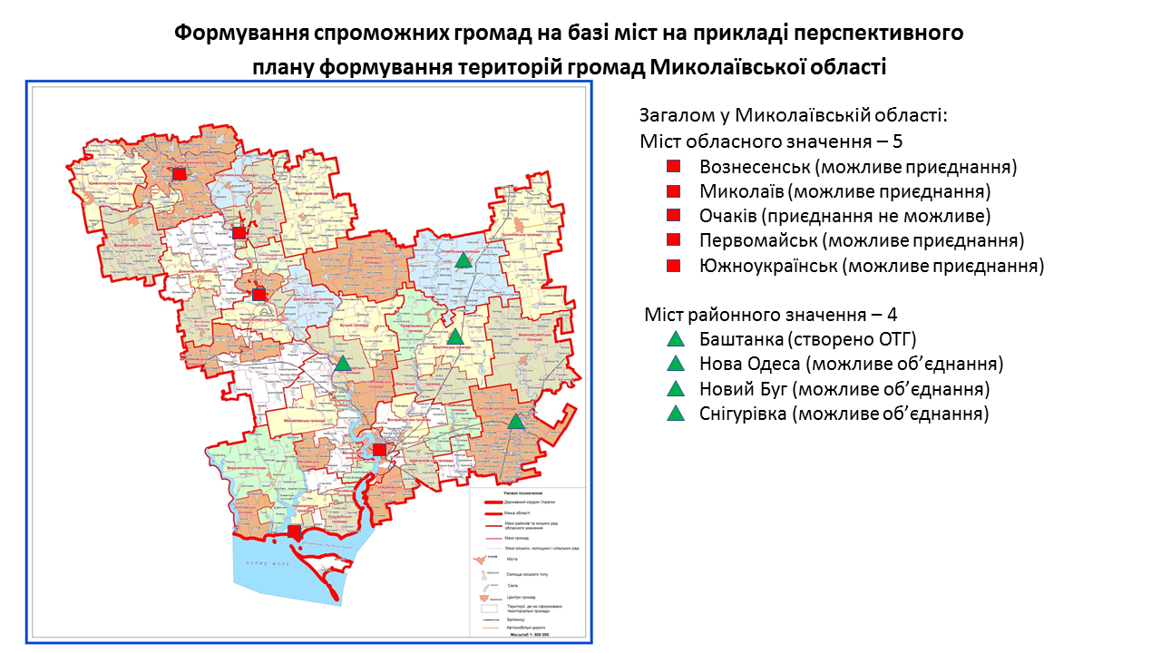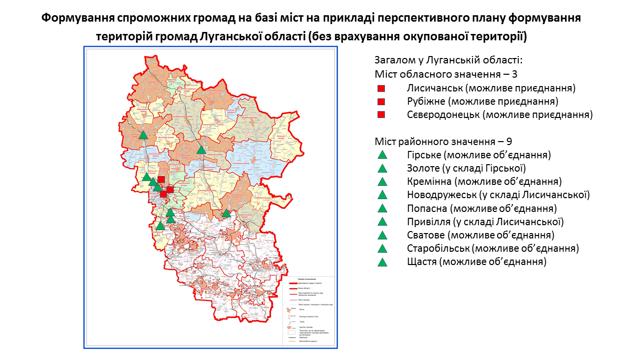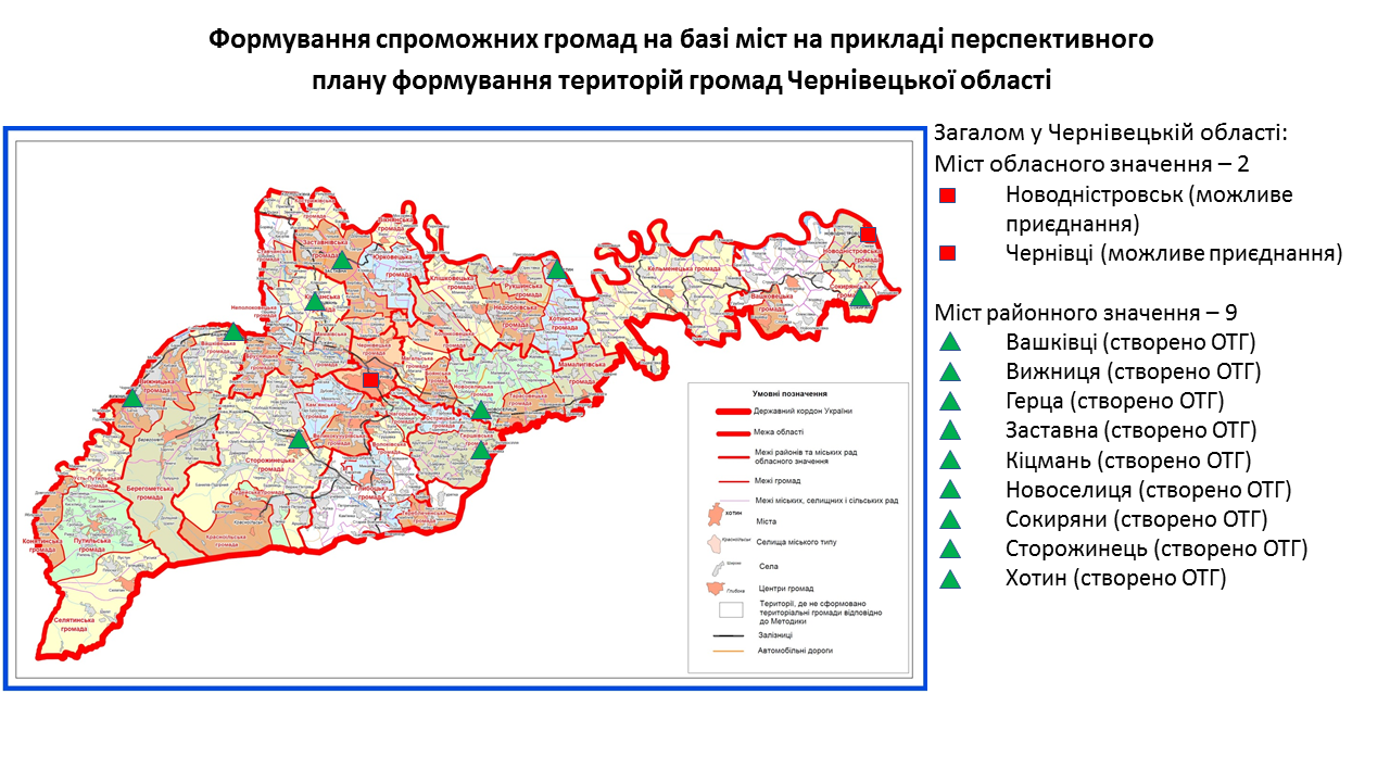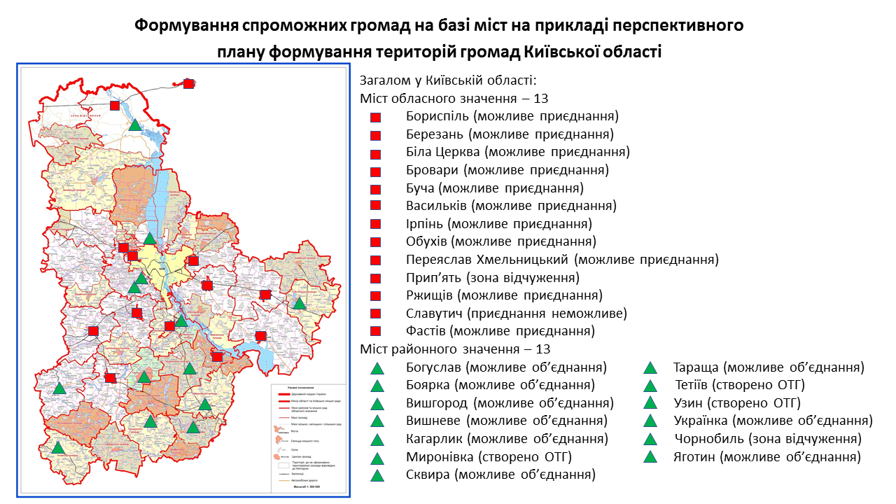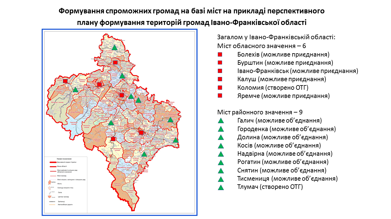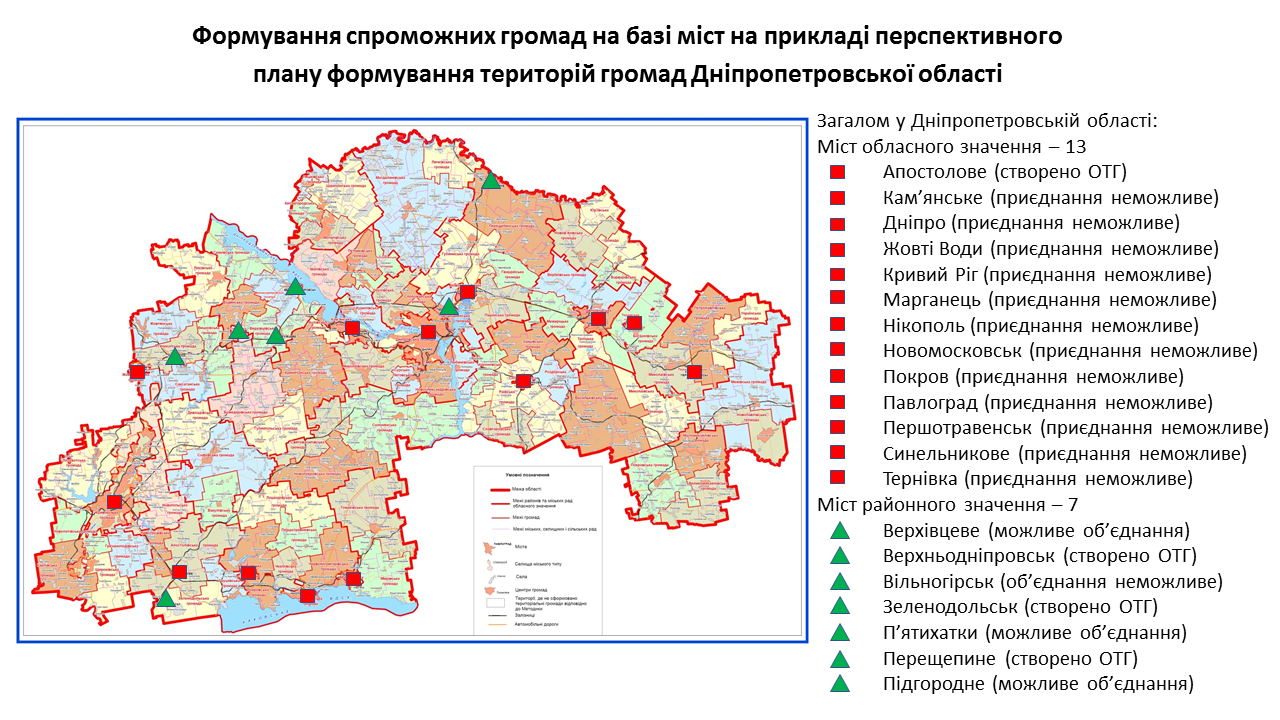 142 міста обласного та 238 міст районного значення передбачені у перспективних планах формування територій громад областей як центри об’єднаних громад. Частина з них вже є центрами громад, частина – у процесі створення ОТГ. Деякі міста при формуванні областями перспективних планів не були визначені як центри громад. Відповідну графічну інформацію (ЗАВАНТАЖИТИ) щодо формування спроможних громад на базі міст розробили у Мінрегіоні. Розробники спиралися на чинні перспективні плани кожної області.