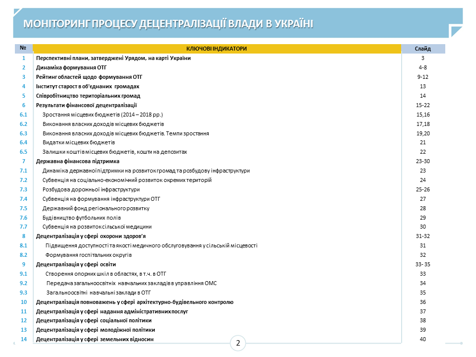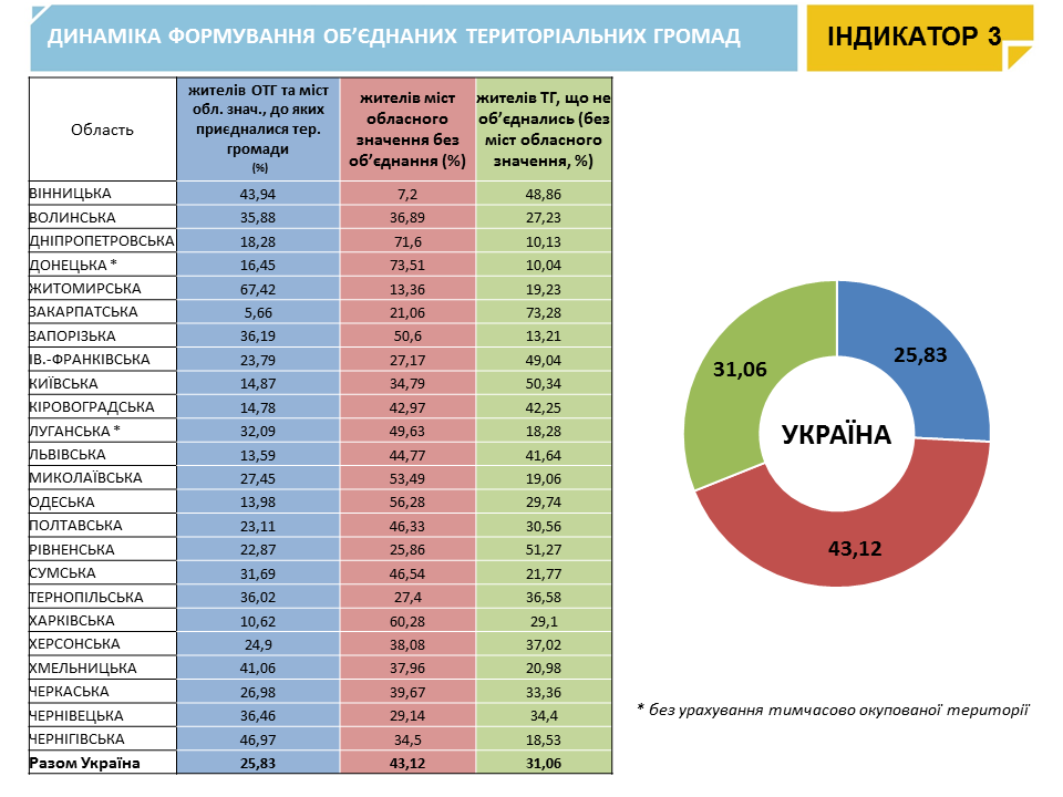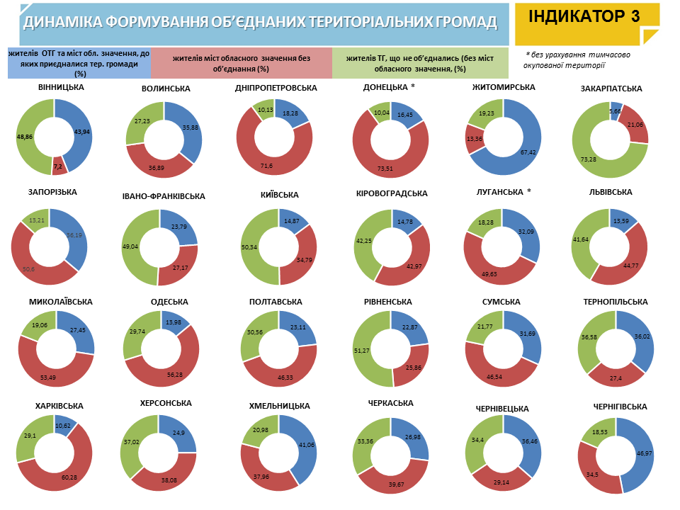Моніторинг свідчить про зростання відсотка територій областей, які покриті перспективними планами формування спроможних громад. У грудні цей показник вже склав 82% проти 77% минулого місяця. Дніпропетровська, Запорізька, Рівненська, Хмельницька та Донецька і Луганська області, за виключенням непідконтрольних територій, впроваджують процес об’єднання громад за перспективними планами, які покривають 100% їх територій.