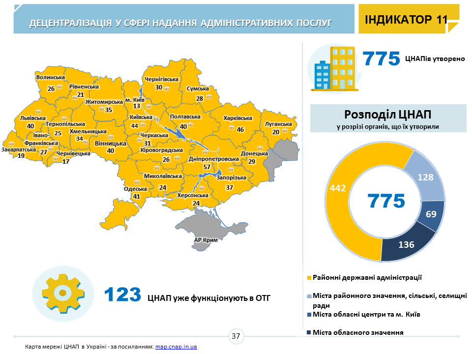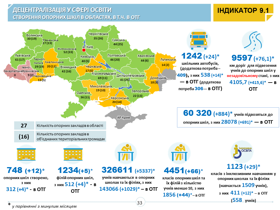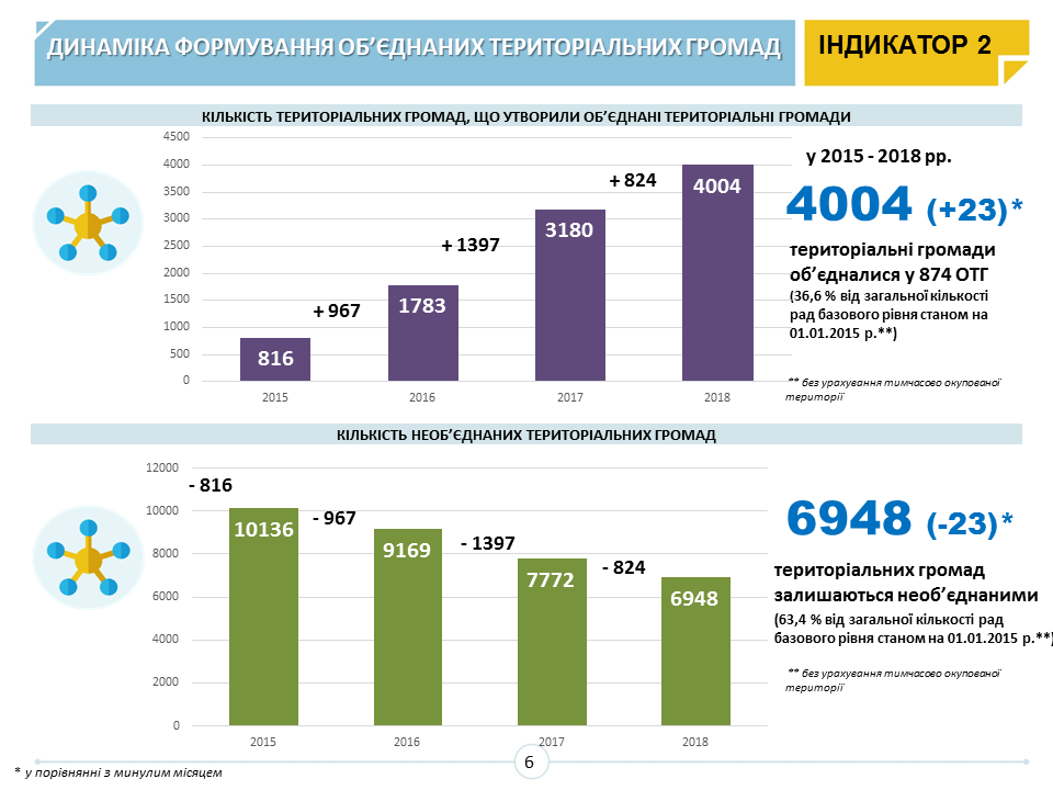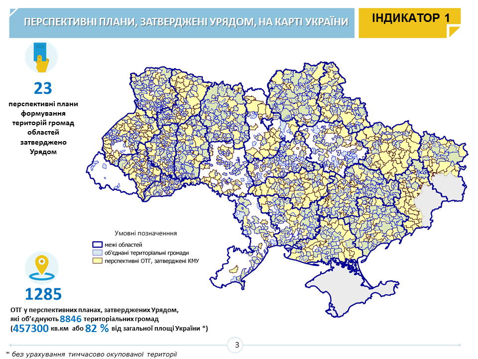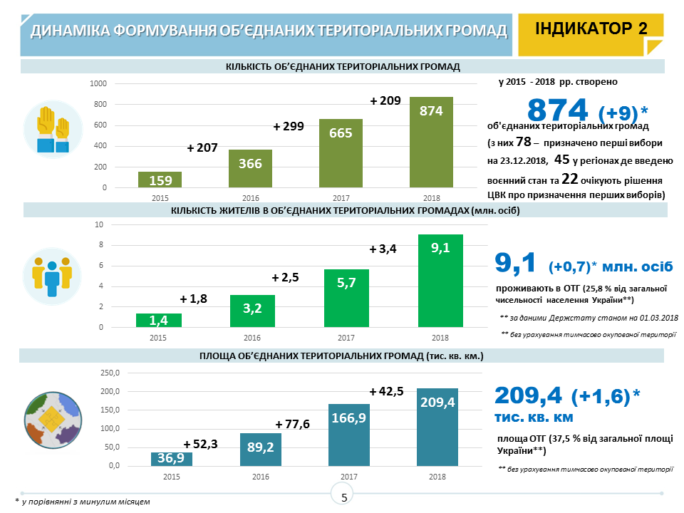До 874 зросла кількість сформованих ОТГ, серед яких 22 ОТГ очікують рішення ЦВК про призначення перших місцевих виборів. Сформували громади і 24 міста обласного значення. На території об’єднаних громад проживає більше 9 млн людей.