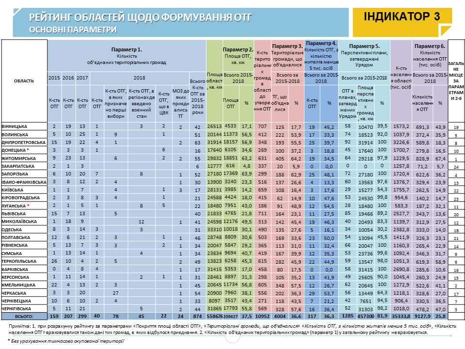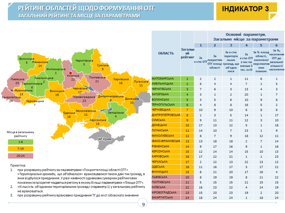 Житомирщина знову лідирує у рейтингу областей щодо формування об’єднаних громад. Про це свідчать дані Моніторингу процесу децентралізації та реформування місцевого самоврядування (ЗАВАНТАЖИТИ), підготовленого Мінрегіоном станом на 10 грудня 2018 року. Хмельницька, Чернігівська, Запорізька, Волинська, Тернопільська також серед лідерів рейтингу – 2-6 місця відповідно.