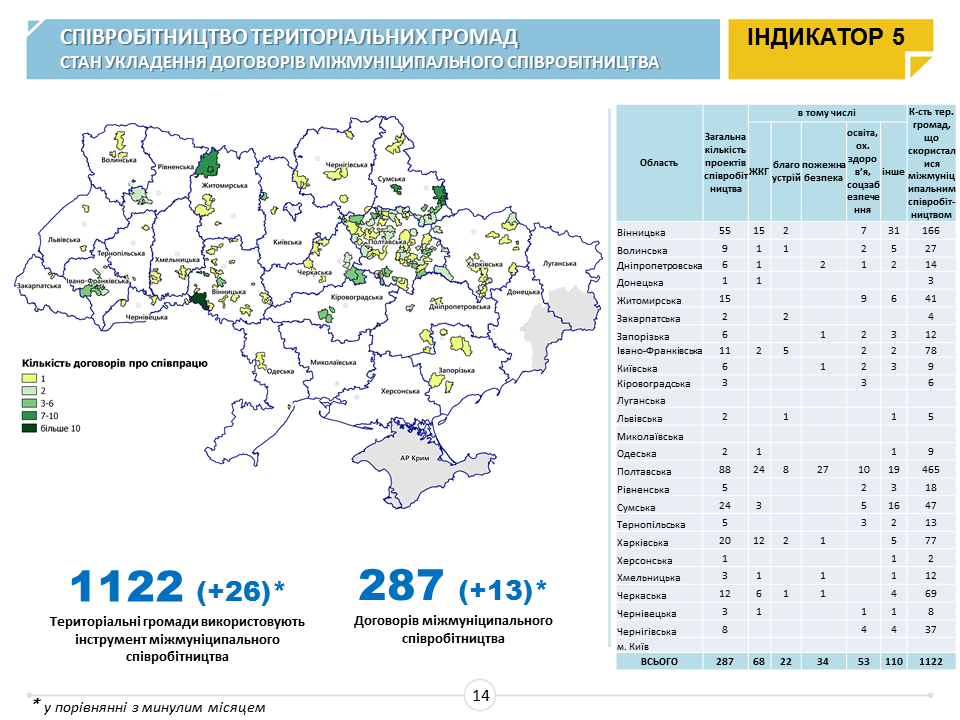 Звернули увагу у Мінрегіоні і на інші показники Моніторингу, зокрема на просування процесу співробітництва територіальних громад. За минулий місяць ще 26 громад скористалися механізмом співробітництва та підписали 13 відповідних договорів. Загалом 1122 громади, більшість з яких у Полтавській та Вінницькій областях, спільно працюють над проектами у сферах ЖКГ, освіти, охорони здоров’я, пожежної безпеки та ін. Без змін у сфері міжмуніципального співробітництва поки що у Миколаївській області – поки жодна з громад не скористалася цим механізмом.