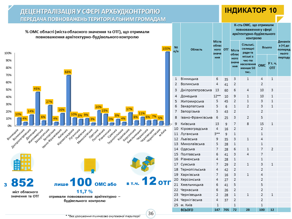 Стурбованість у відомстві викликають показники децентралізації у сфері архітектурно-будівельного контролю. З 852 міст обласного значення та об’єднаних громад тільки 100 перебрали на себе такі повноваження.