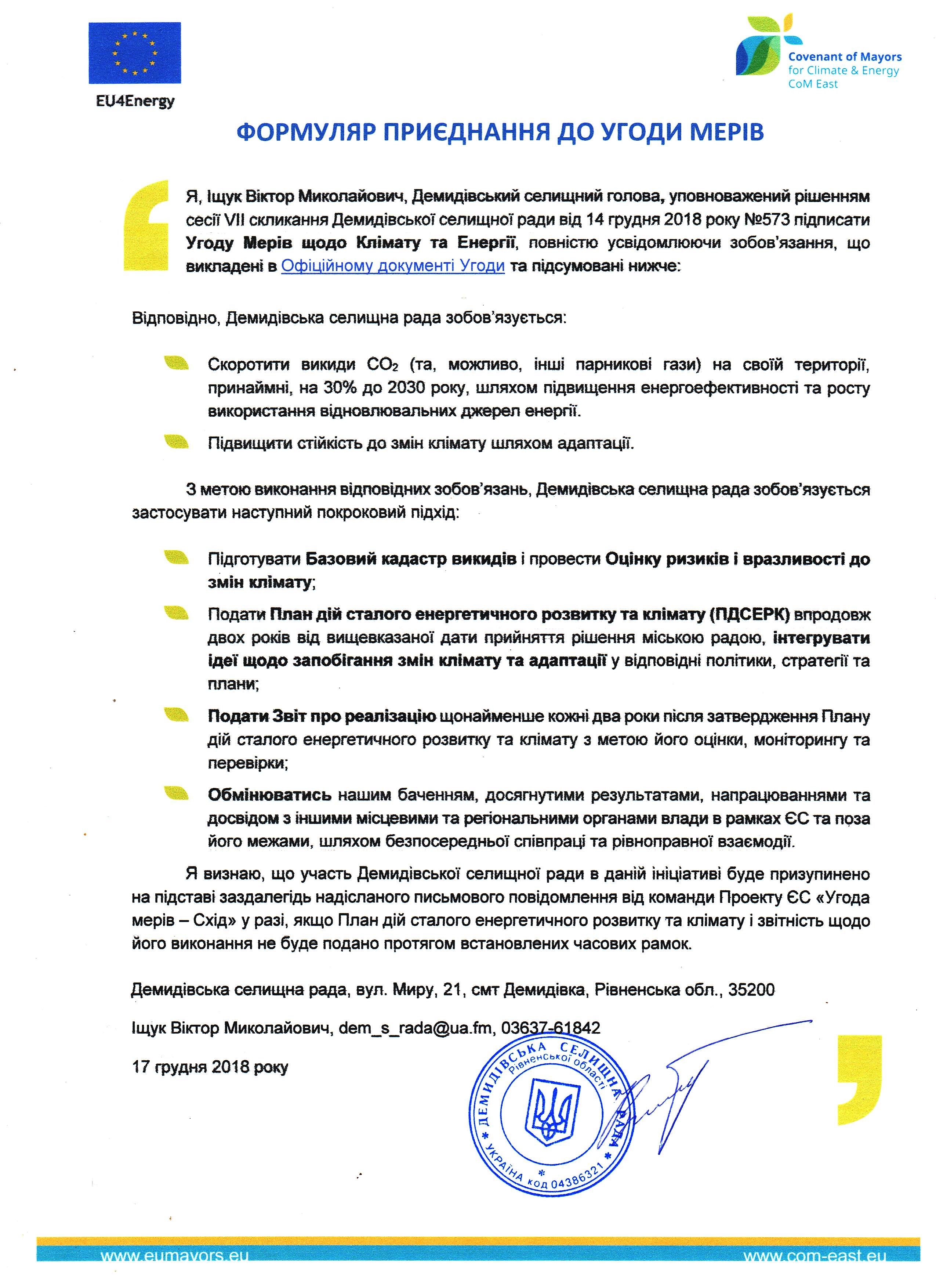14 грудня 2018 року Демидівська об’єднана територіальна громада першою серед сільських та селищних громад Рівненщини приєдналася до європейської ініціативи «Угода мерів», повідомили в ОТГ.