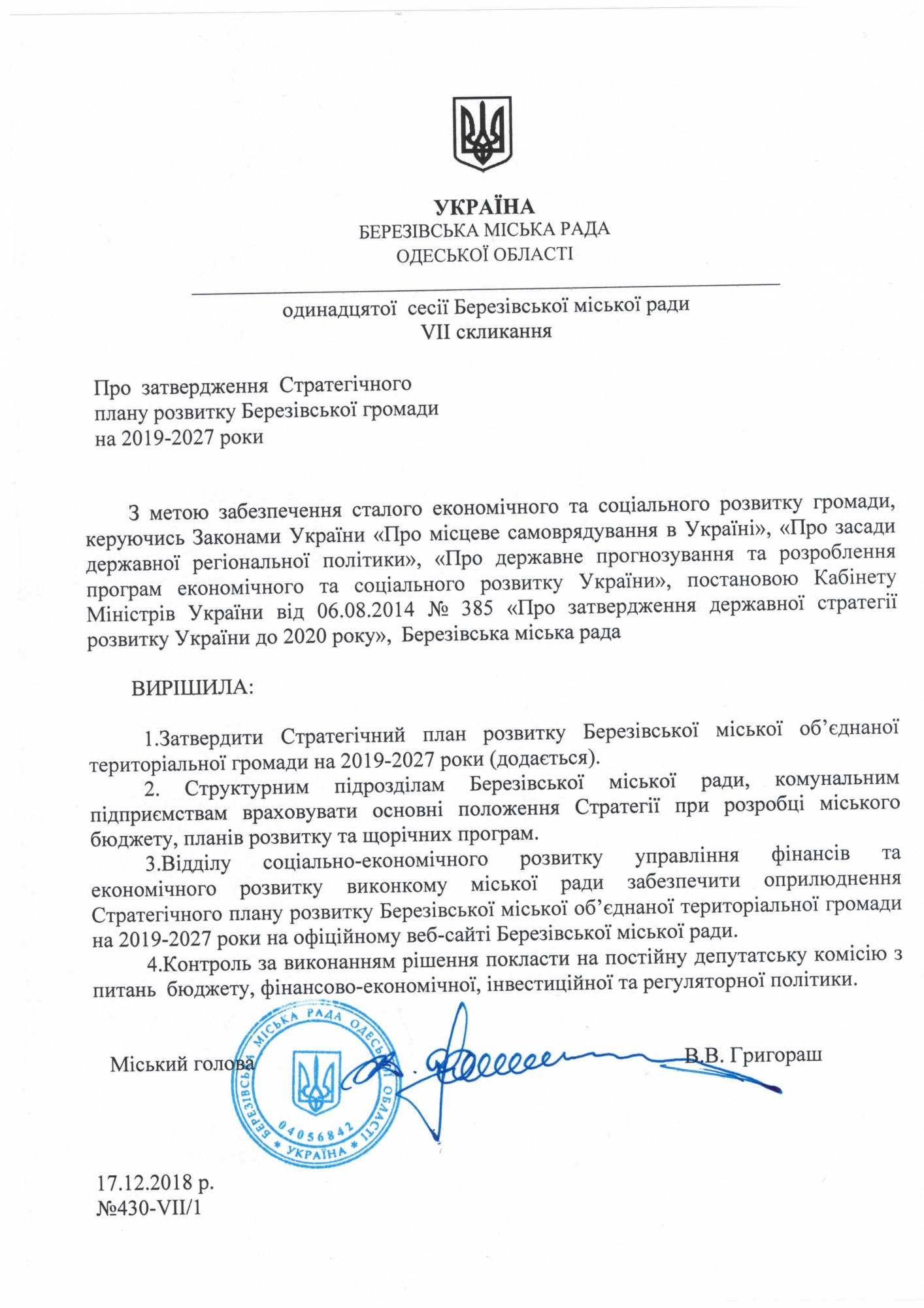 На одинадцятій сесії Березівської міської ради, яка відбулася у селі Вікторівка (ця сільрада приєдналася до Березівки під час об'єднання громади), депутати затвердили Стратегічний план розвитку ОТГ на 2019-2027 роки. Документ було розроблено за сприяння Одеського Центру розвитку місцевого самоврядування, створеного за підтримки Програми «U-LEAD з Європою» та Мінрегіону.
