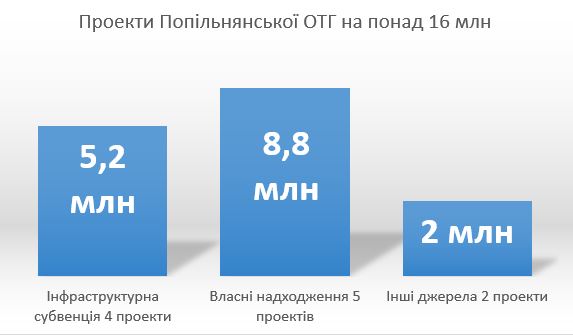 Для проведення масштабних заходів з відновлення інфраструктури у громаді використали можливості декількох державних фондів, кошти субвенцій та власні надходження. За рік було реалізовано 11 проектів загальною вартістю понад 16 мільйонів гривень.