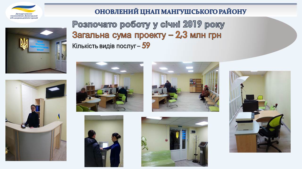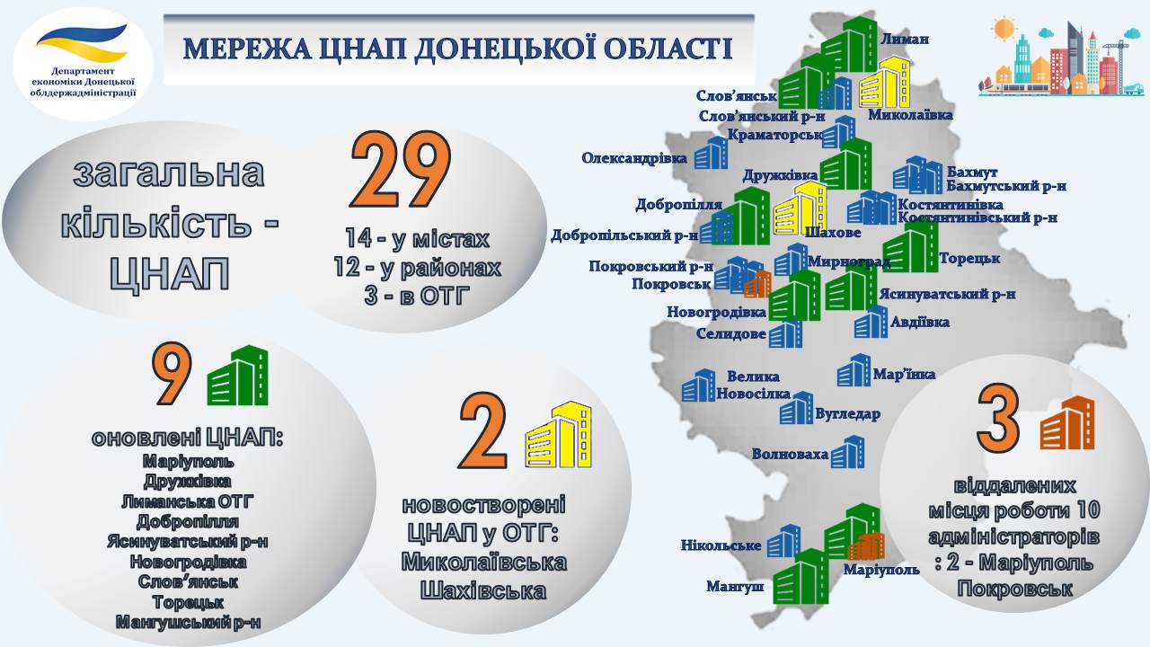 На Донеччині загалом працюють 29 Центрів надання адміністративних послуг. Два з них повністю нові – в Шахівській сільській ОТГ та Миколаївській міській ОТГ. Нещодавно оновлені 9 ЦНАПів, в тому числі один в ОТГ – Лиманській міській громаді. З різних джерел фінансування на розбудову та оновлення ЦНАП було залучено понад 90 млн грн.