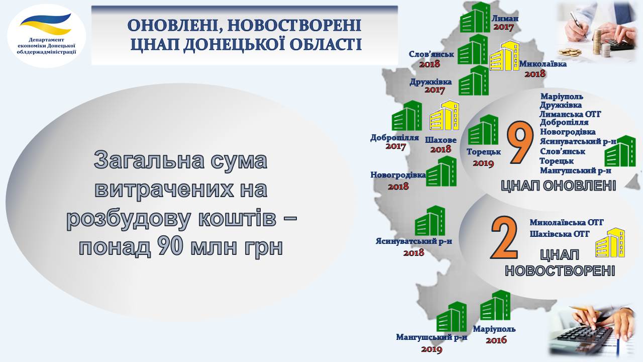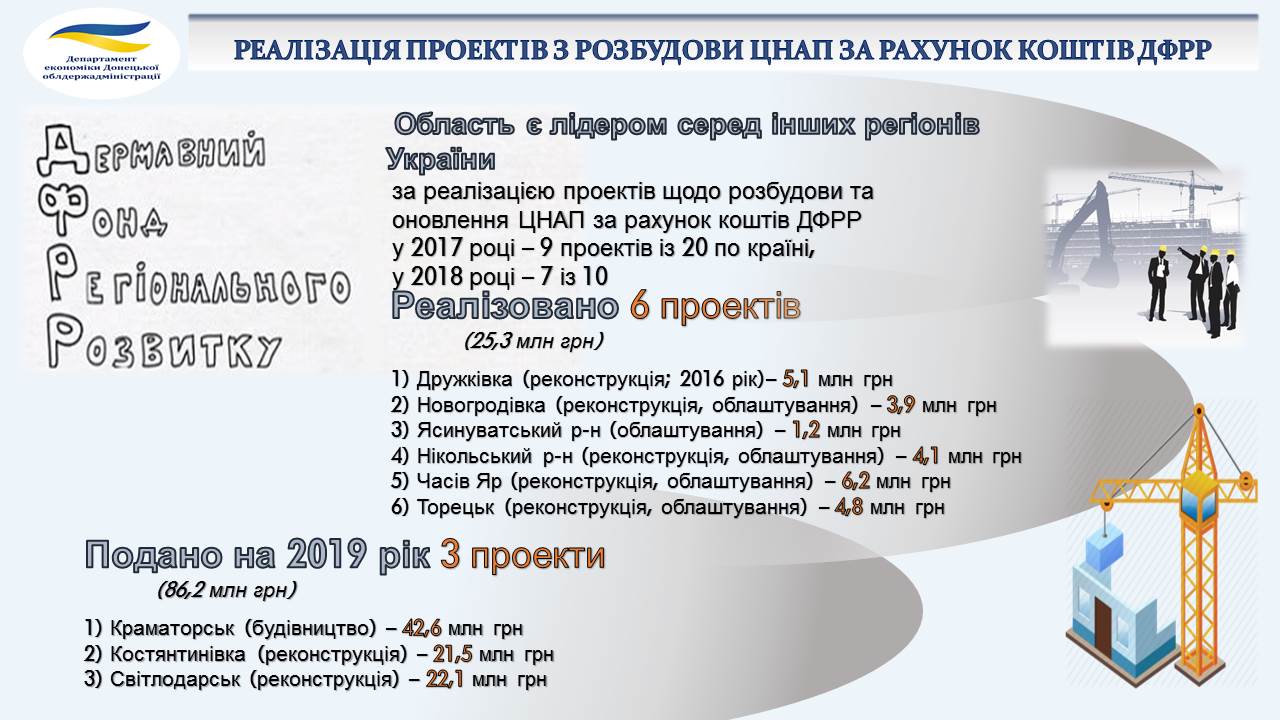 Донецька область є лідером серед інших регіонів України з реалізації проектів щодо розбудови та оновлення ЦНАП за рахунок коштів ДФРР. У 2017 році таких проектів було 9 із 20 по країні, у 2018 році – 7 із 10. Уже реалізовані шість проектів загальною вартістю 25,3 млн грн. Провели реконструкцію та облаштування ЦНАП у Дружківці, Новогродівці, Ясинуватському, Нікольському районі, Часів Ярі та Торецьку. На фінансування в 2019 році подані три проекти – будівництво ЦНАПу в Краматорську, реконструкція в Костянтинівці та Світлодарську.