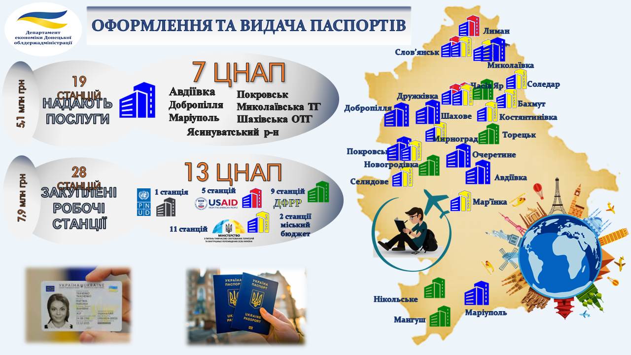 Тільки за минулий рік розпочато оформлення та видачу внутрішніх та закордонних паспортів у семи ЦНАП в Авдіївці, Маріуполі, Покровську, Добропіллі, Ясинуватському районі, Шахівській та Миколаївській ОТГ. Роботу Центрів забезпечують 19 станцій, на закупівлю яких використали понад 5 млн грн. Закуплені ще 28 станцій, які проходять необхідне оформлення, щоб розпочати роботу в 13-ти ЦНАП. Були використані кошти з різних джерел: місцевого, державного бюджету та донорських організацій – загалом майже 8 млн грн.