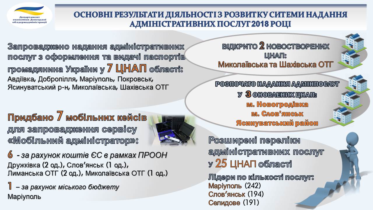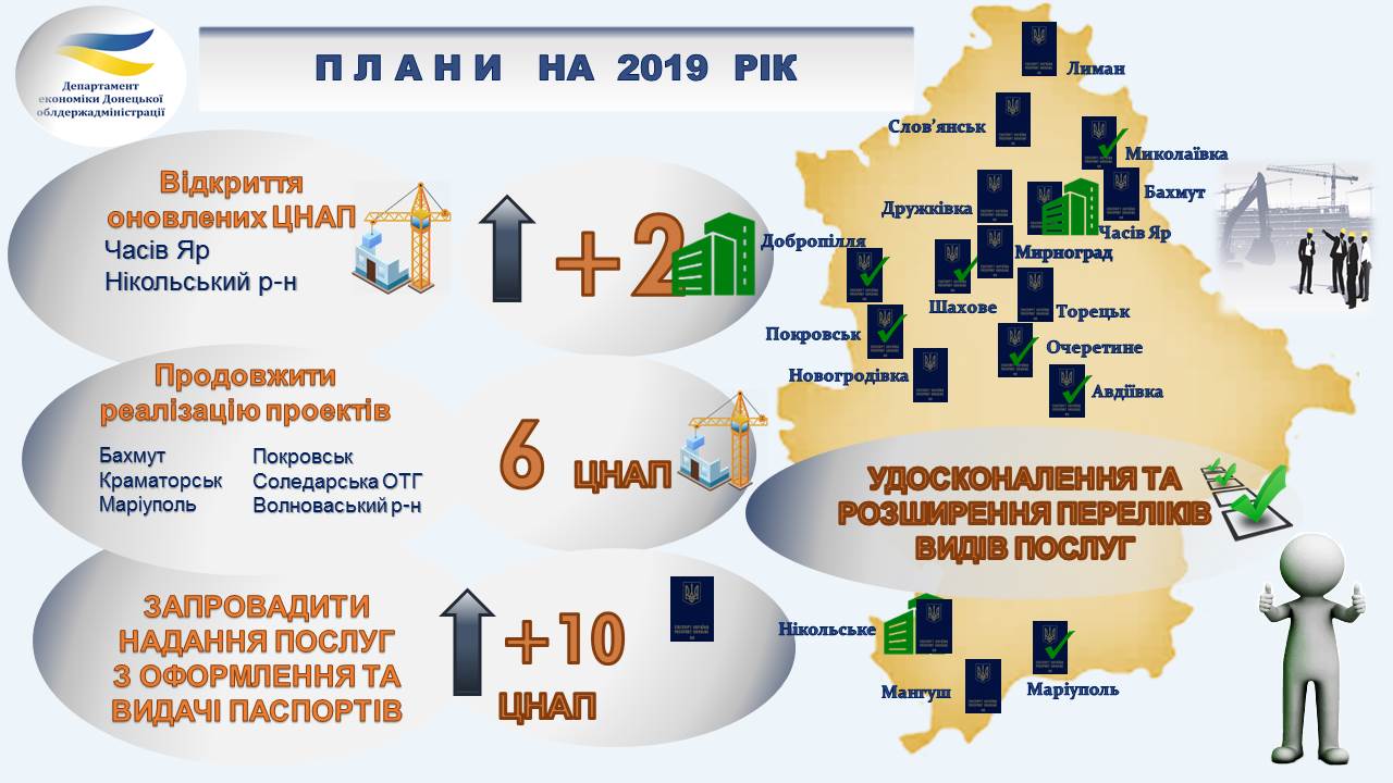 Серед планів на 2019 рік – відкриття двох оновлених центрів надання адмінпослуг у місті Часів Яр та Нікольському районі, продовження оновлення шести ЦНАПів у Бахмуті, Краматорську, Маріуполі, Покровську, Соледарській ОТГ, Волноваському районі, запровадження надання послуг з оформлення та видачі паспортів щонайменше у 10 ЦНАПах.