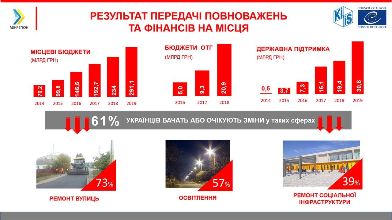 «Якщо у 2015 році лише 19% відзначали певні зміни на краще у своєму населеному пункті в результаті збільшення місцевих бюджетів, то у 2018-му людей, які бачать реальні зміни – 39,5%. Плюс до цього слід додати ще 22% тих, хто чули, що зміни відбуваються. Тобто загалом на кінець 2018 року 61,5% українців або відчули покращення, або очікують на нього», — розповів урядовець.